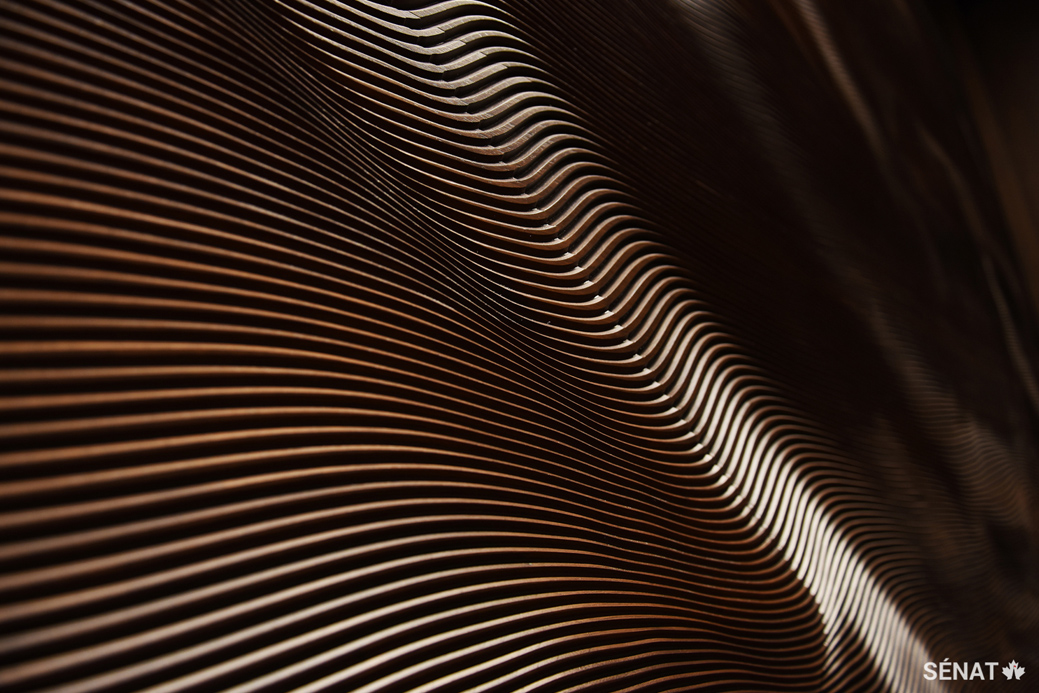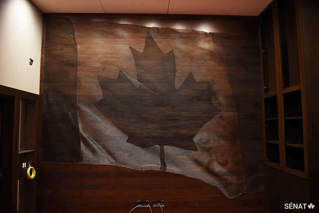 Des panneaux de noyer sculptés à l’effigie du drapeau du Canada recouvrent le mur est de la Chambre du Sénat. Ces drapeaux servent de toile de fond aux trônes dans la nouvelle Chambre. Les courbes et le contour des sculptures produisent un effet de mouvement, comme si les drapeaux flottaient au vent.
