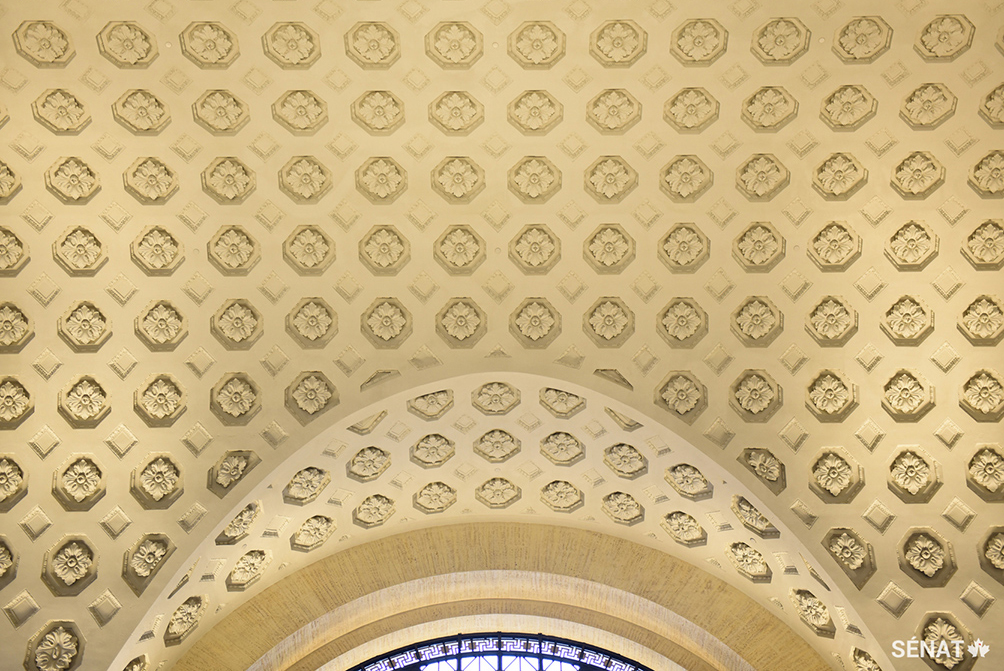 Dans le foyer de la demeure temporaire du Sénat du Canada, le plafond de plâtre patrimonial qui date de l’époque de la gare d’Ottawa a été remis en état.