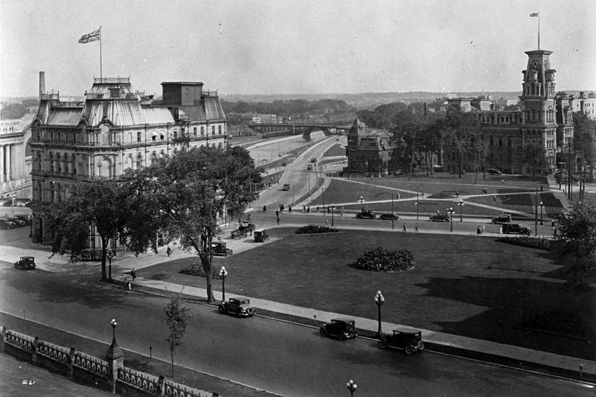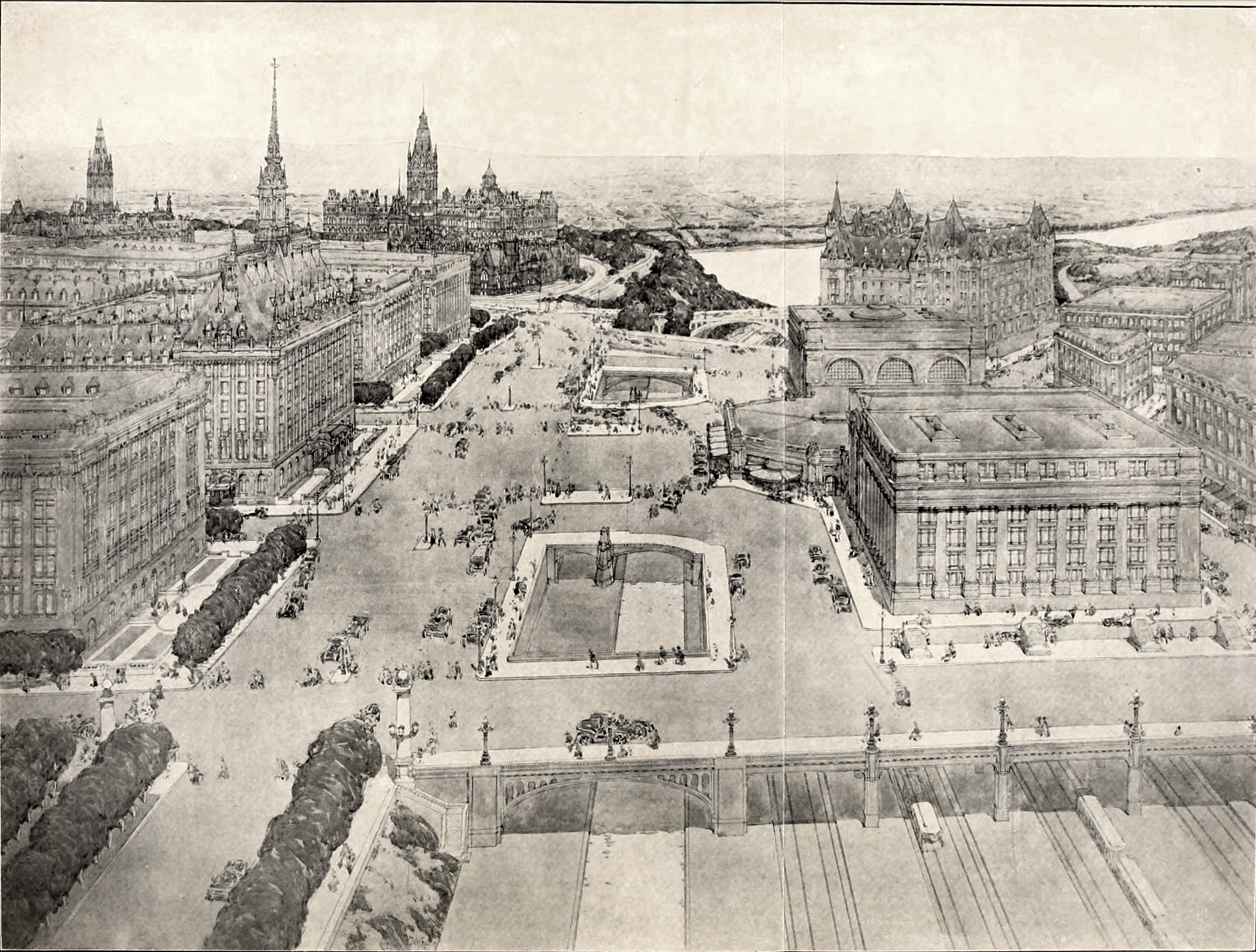 Au début des années 1900, Ottawa était aux prises avec des rues étroites et un problème de congestion routière. Un plan dessiné en 1915 par l’urbaniste Edward Bennett, jamais formellement adopté, prévoyait une place publique gigantesque, au bord du canal Rideau, flanquée d’édifices de style Beaux-Arts à l’ouest et d’une station centrale élargie à l’est. (Université Queen’s – disponible en anglais seulement)