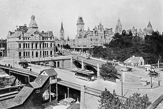 L’ancien bureau de poste d’Ottawa en 1903, avec la Colline parlementaire en arrière-plan. À l’avant-plan, le pont des Sapeurs, construit en 1827, et, derrière celui-ci, le pont Dufferin, construit dans les années 1870. Lors de la construction de la gare centrale, ces deux ponts ont été détruits et remplacés par une seule structure, qui se nomme aujourd’hui le pont Plaza. (Bibliothèque et Archives Canada)