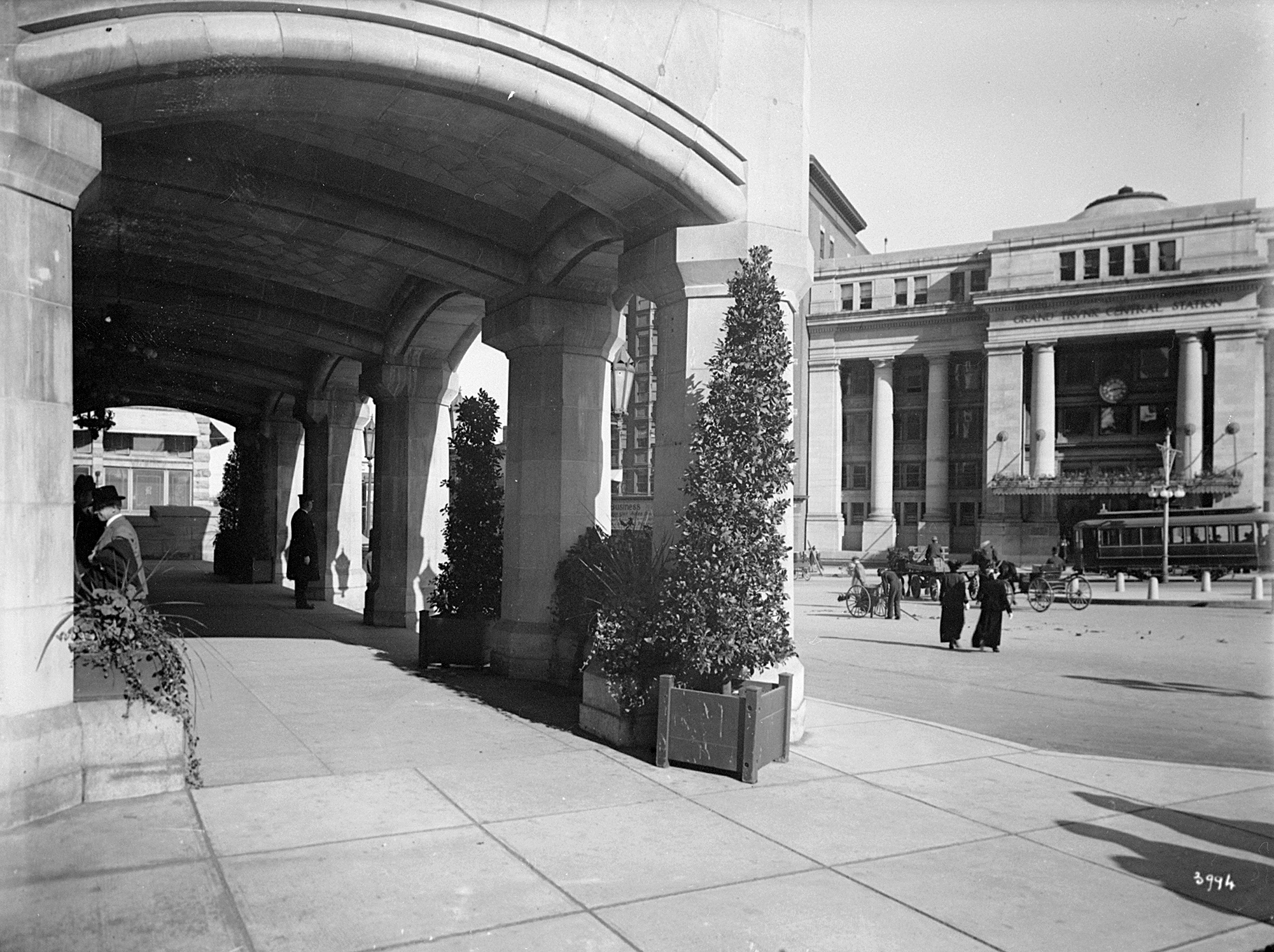 Vue de la gare centrale Grand Trunk à partir de l’entrée du Château Laurier en 1916, quatre ans après leur ouverture conjointe. (Bibliothèque et Archives Canada)