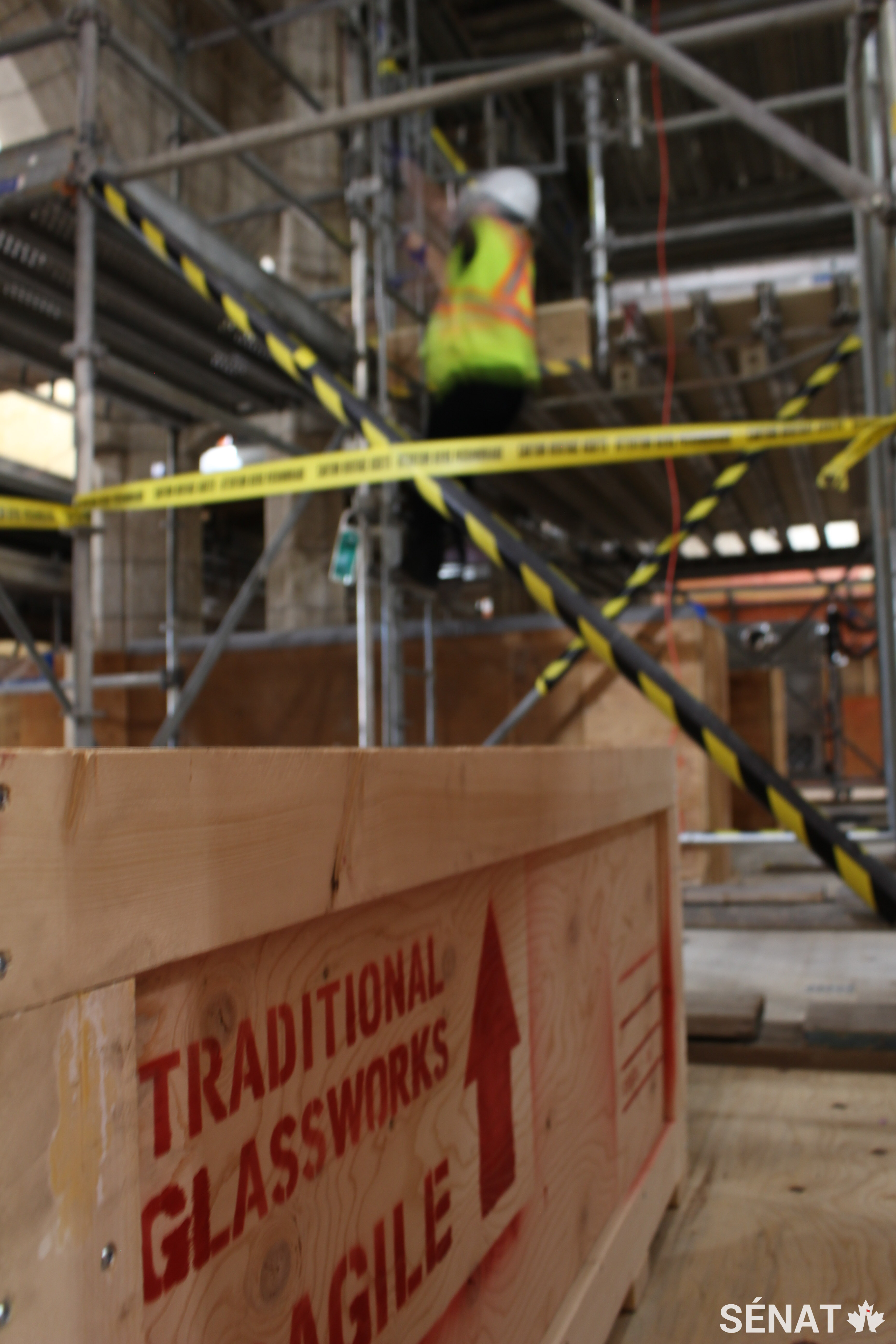 Un travailleur retourne dans les échafaudages, alors que la première section du vitrail repose en toute sécurité dans sa caisse de bois. Le vitrail s’est révélé en bon état. Il n’a besoin que d’un petit coup d’aspirateur — muni d’une brosse douce — et d’un léger nettoyage au chiffon de coton.