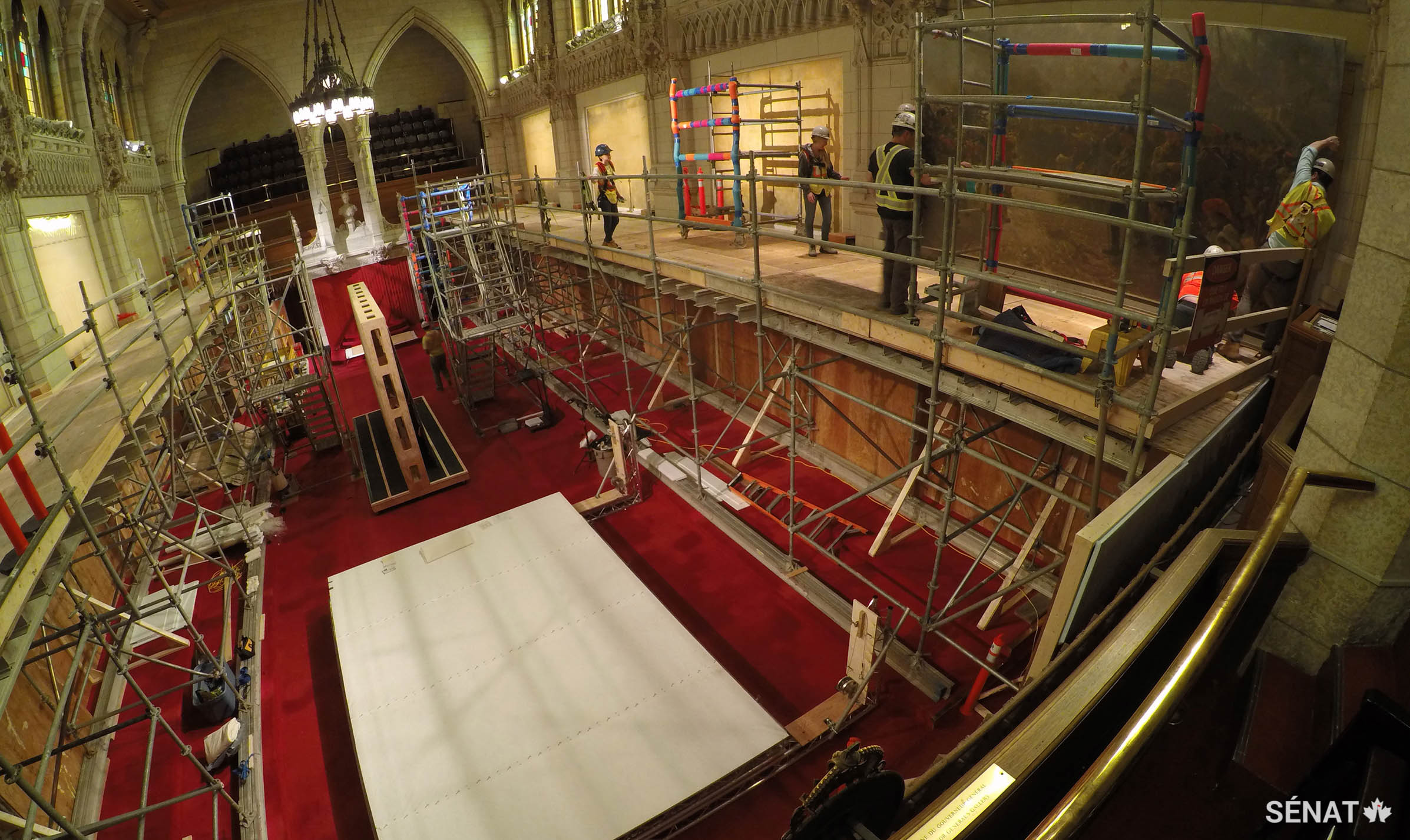 Pendant huit semaines, en mai et juin 2019, la Chambre du Sénat s’est transformée en atelier. Des échafaudages, des chevalets et des plateformes de descente de charge ont été assemblés sur le plancher de la Chambre du Sénat pour aider les conservateurs à descendre et à emballer de façon sécuritaire les huit tableaux illustrant des scènes de guerre.