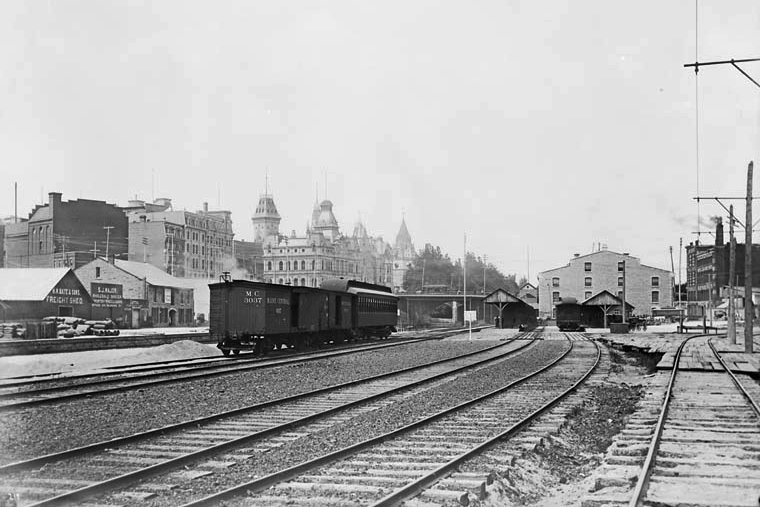 Les hangars ferroviaires au sud de la gare centrale apparaissent sur cette photo de 1895, sur laquelle on aperçoit également, au loin, la Colline du Parlement et l’ancien édifice de la poste. (Bibliothèque et Archives Canada)