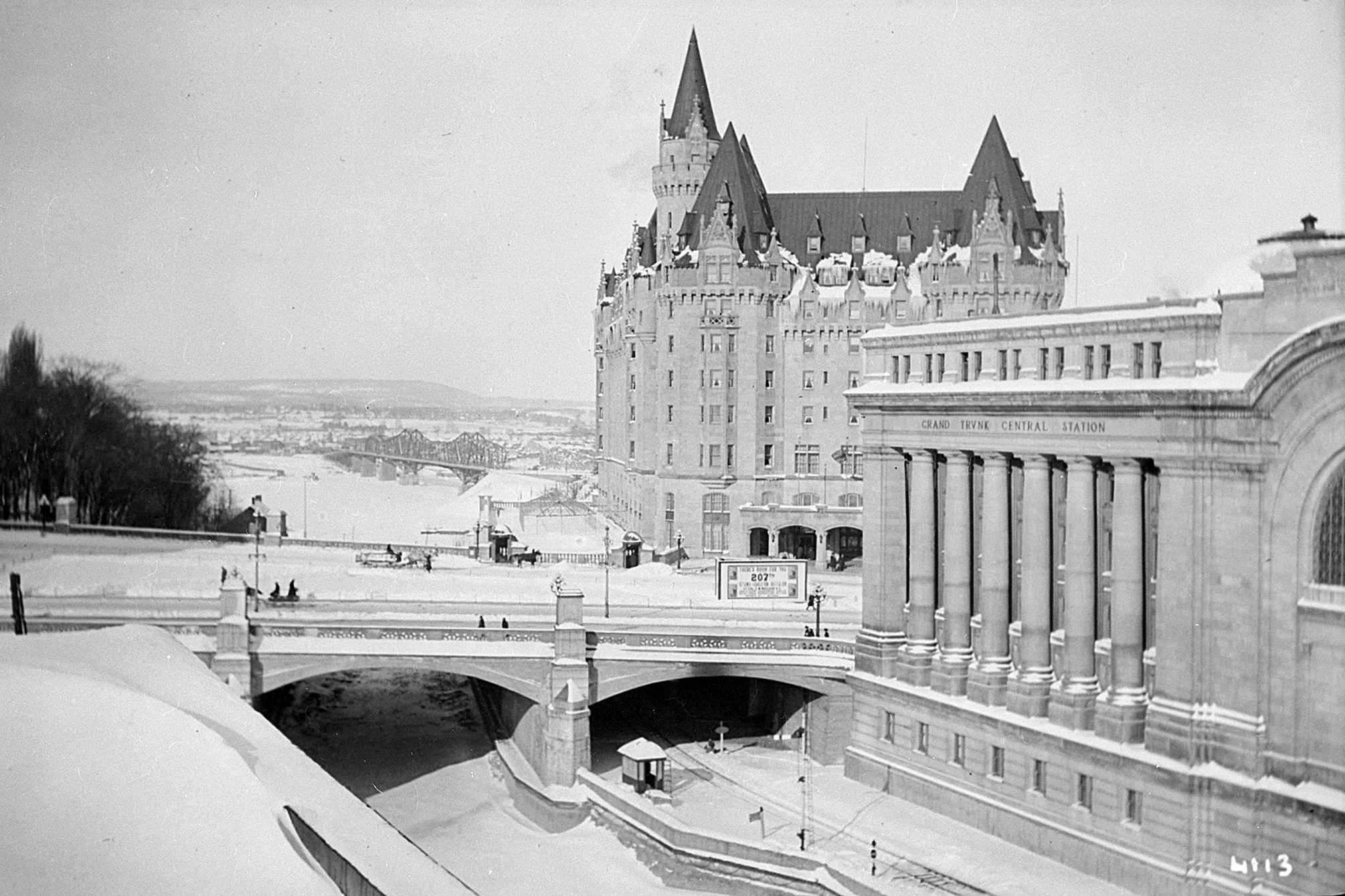 La gare centrale Grand Trunk, le pont Plaza et le Château Laurier — tous trois achevés en 1912 — transforment cette partie de la ville, ici photographiée en 1916. (Bibliothèque et Archives Canada)