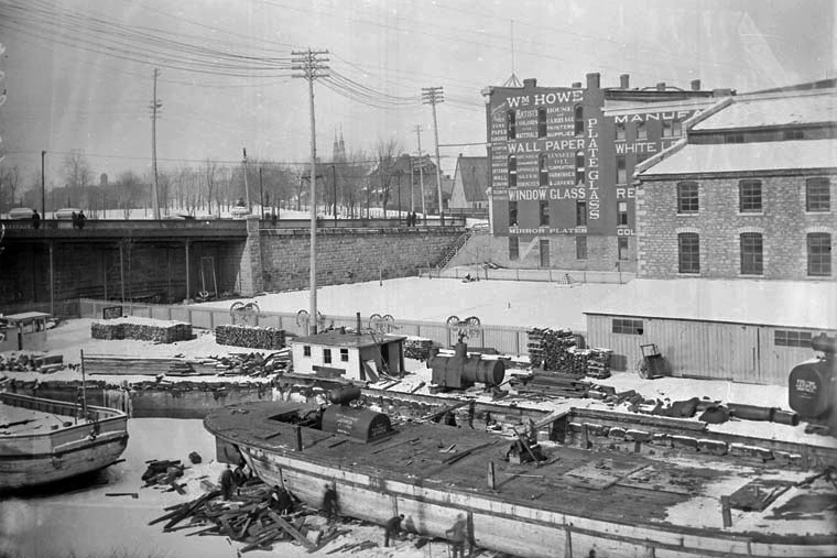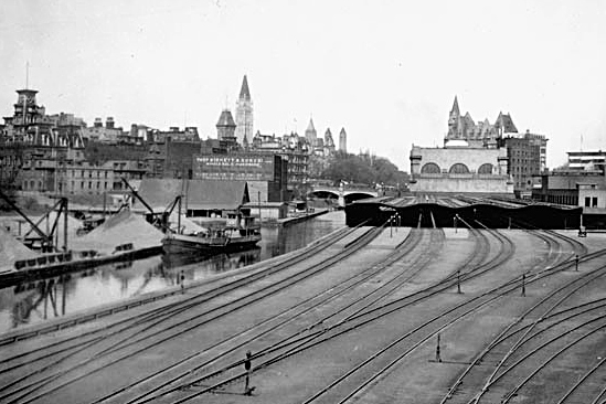 La gare centrale de John Rudolphus Booth, qui se trouvait au même endroit que l’actuel Centre de conférences du gouvernement, était un terminal de marchandise au moment où a été prise cette photo, en 1896. (Bibliothèque et Archives Canada)