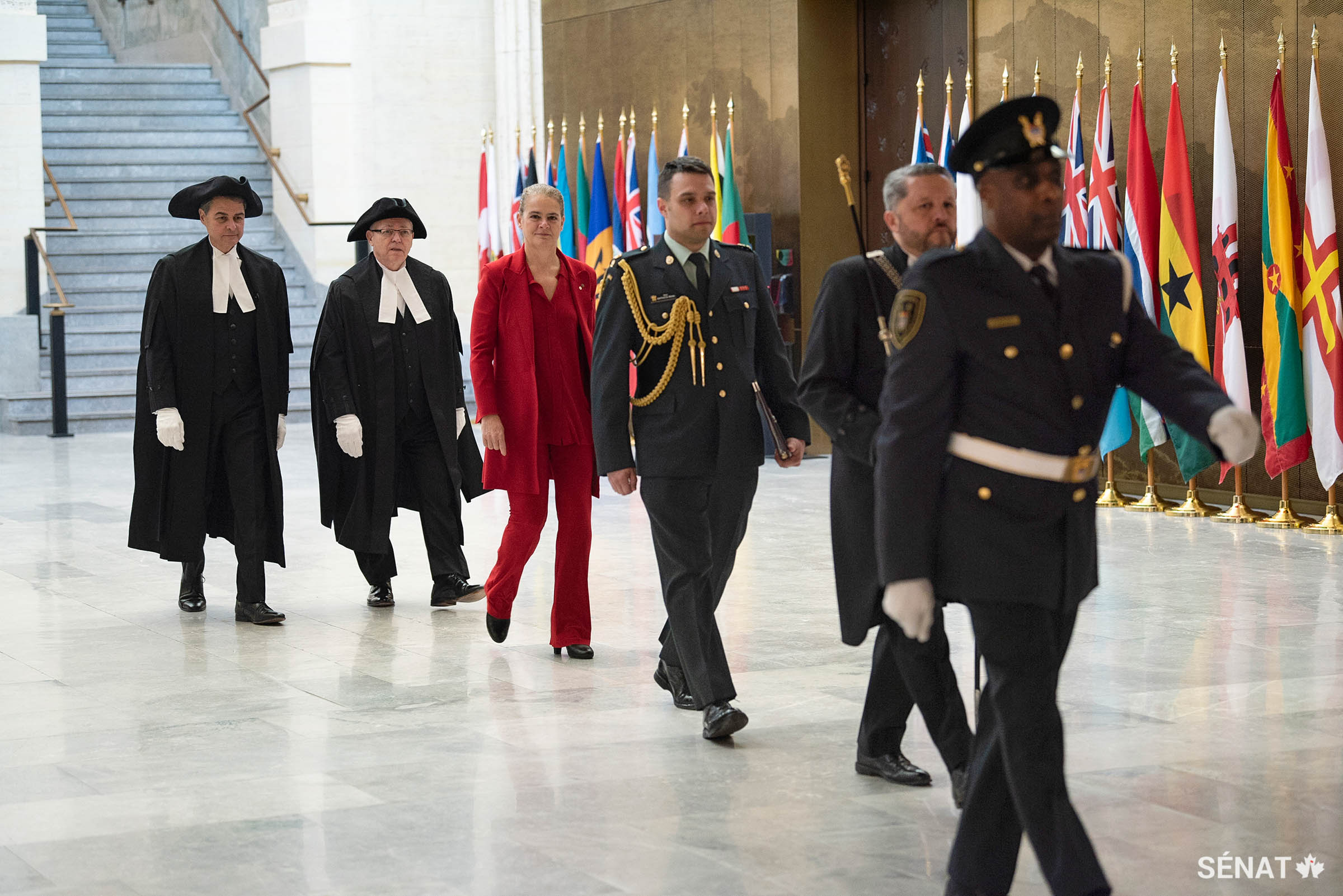 À partir de la gauche : Anthony Rota, Président de la Chambre des communes; George J. Furey, Président du Sénat; et Julie Payette, gouverneure générale, sont escortés dans le foyer du Sénat par une garde cérémonielle, dont l’huissier du bâton noir, J. Greg Peters, deuxième à partir de la droite.