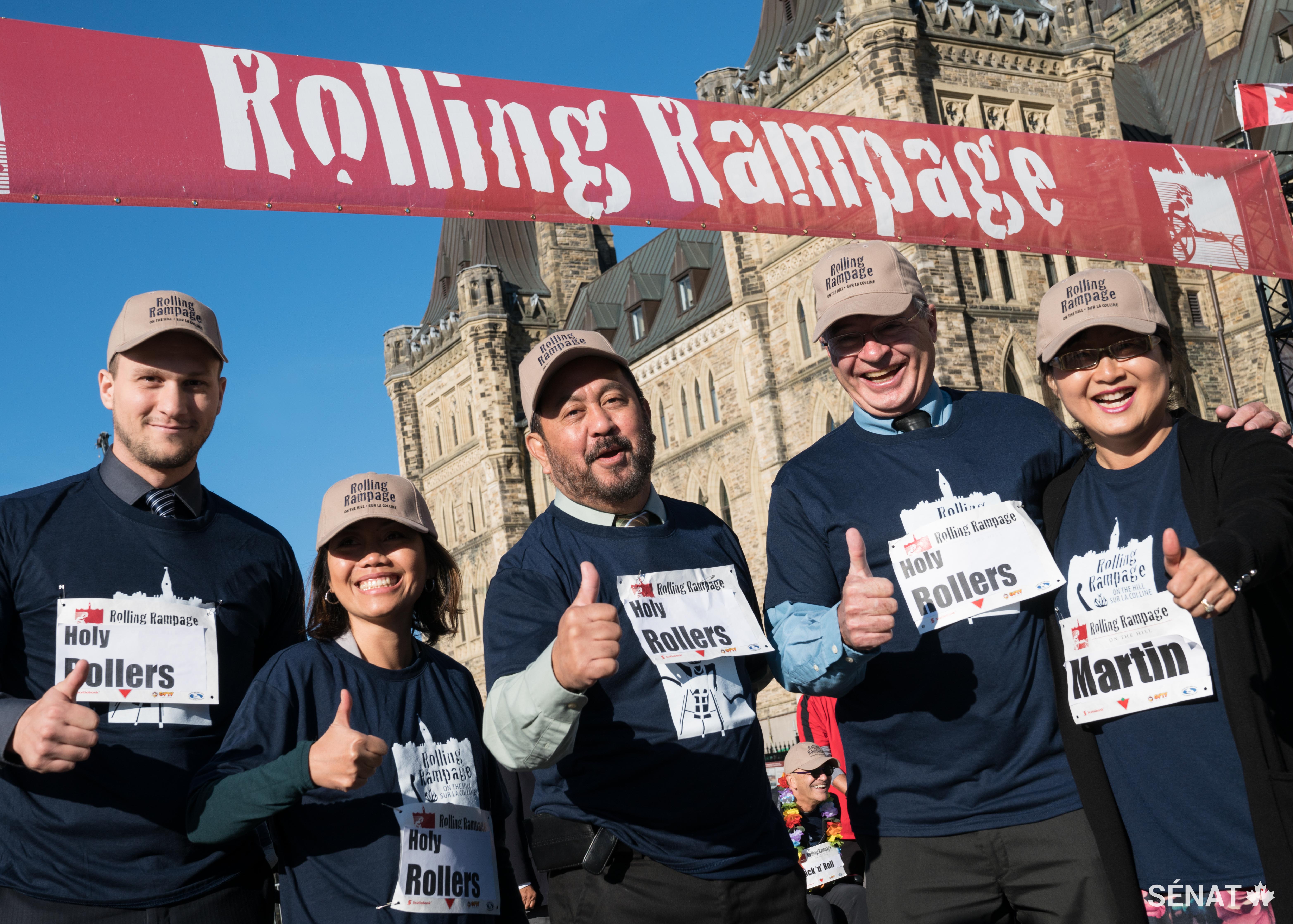 Le jeudi 5 octobre — Les sénateurs Tobias Enverga, Dennis Patterson et Yonah Martin se sont impliqués pour une bonne cause. Ils ont coprésidé la 6e édition de la course #RollingRampage en collaboration avec la Canadian Foundation for Physically Disabled Persons. Cette course, qui se déroule aux abords du Parlement, souligne les réalisations des athlètes de haut niveau en fauteuil roulant et met en lumière les difficultés auxquelles se heurtent les personnes handicapées.