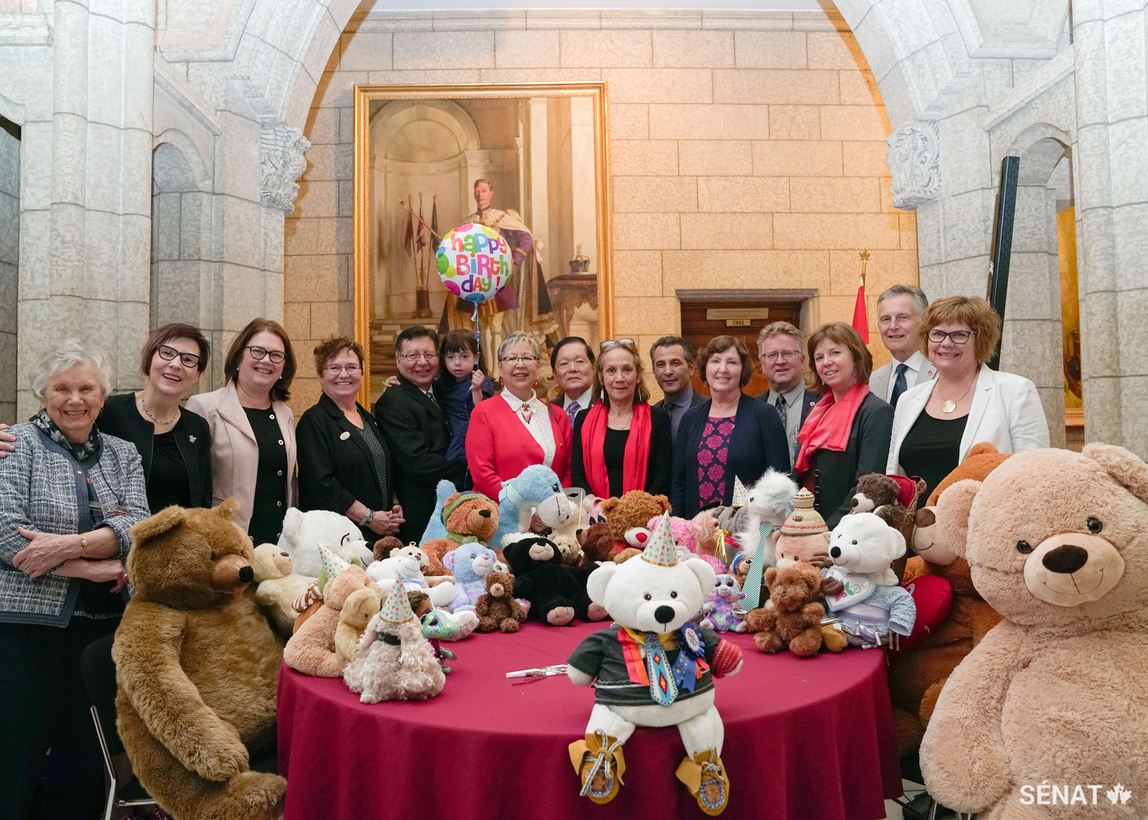 Le jeudi 10 mai – L’ancienne sénatrice Landon Pearson, la sénatrice Yvonne Boyer, le sénateur Daniel Christmas, la sénatrice Mary Coyle, la sénatrice Lillian Eva Dyck, le sénateur Victor Oh, la sénatrice Mary Jane McCallum, le sénateur Robert Black et le sénateur Larry W. Smith, accompagnés de membres de la Chambre des communes et d’autres leaders communautaires, soulignent la Journée de l’ourson-témoin, une nouvelle campagne lancée par la Société de soutien à l’enfance et à la famille des premières nations du Canada. La campagne vise à faire appliquer intégralement le Principe de Jordan qui a pour but de faire en sorte que les enfants des Premières Nations aient le même accès aux services publics que les autres enfants du Canada.