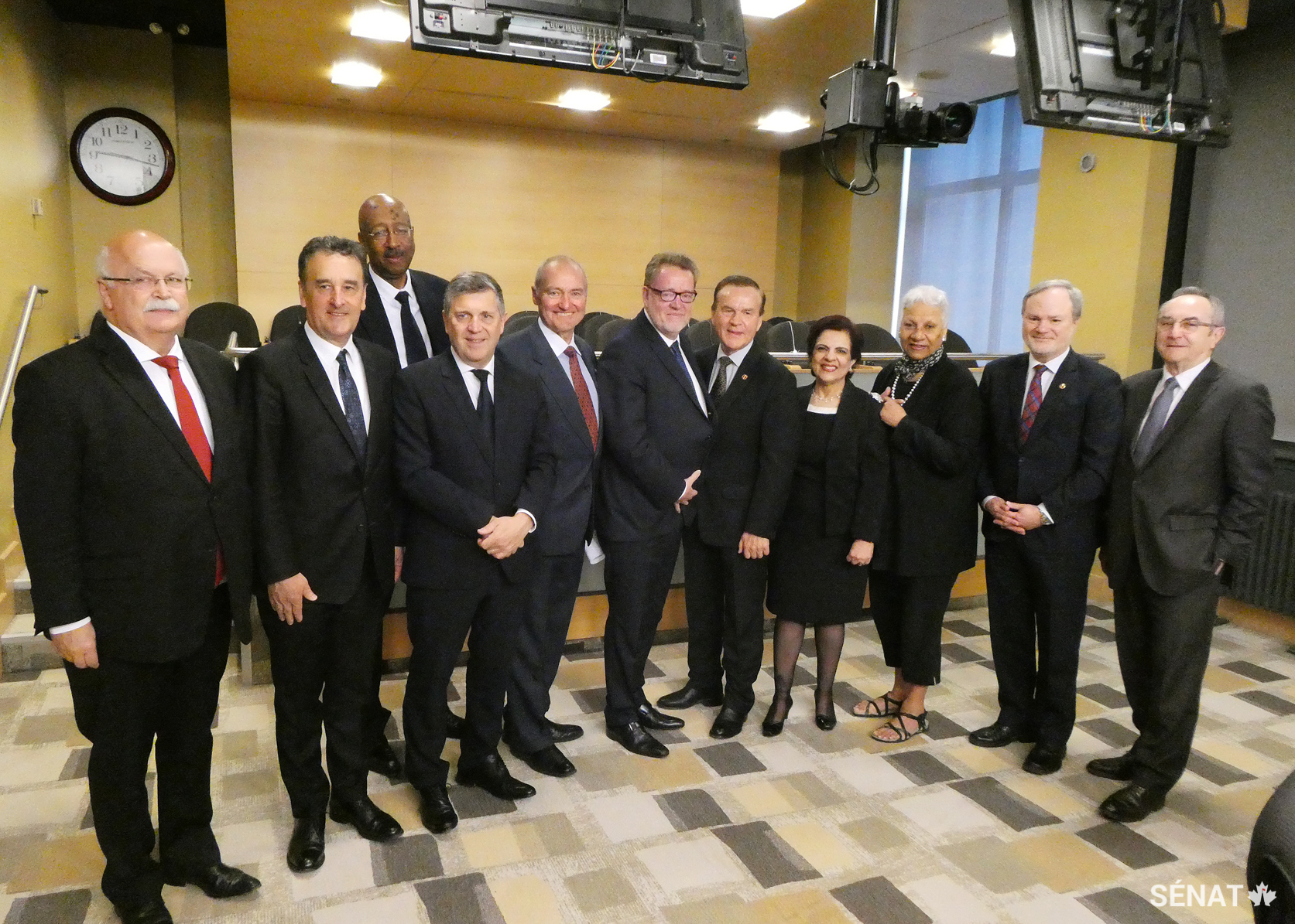 Le mardi 1er mai – Le Comité sénatorial des finances nationales accueille des membres du Comité des finances du Sénat français à Ottawa pour renforcer les liens entre les deux chambres hautes et apprendre les uns des autres. À partir de la gauche, on aperçoit les sénateurs français Claude Raynal, Bernard Delcros, Georges Patient et Albéric de Montgolfier, le sénateur canadien Joseph A. Day, le sénateur français Vincent Éblé, les sénateurs canadiens Percy Mockler, Mobina S.B. Jaffer, Anne C. Cools et André Pratte et le sénateur français Charles Guené.