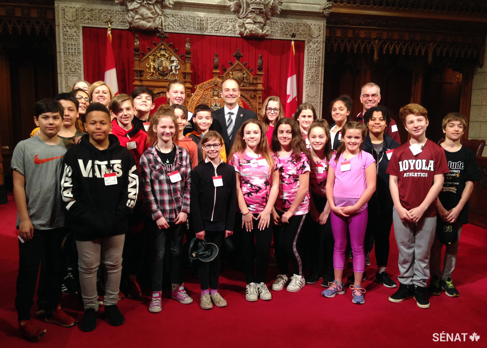Le vendredi 4 mai – Dans le cadre d’une activité SenGAGE qui vise à sensibiliser les étudiants au travail qui se fait sur la Colline du Parlement, le sénateur Marc Gold parle des travaux que le Sénat accomplit à des élèves de l’école élémentaire St. Jude de Deux-Montagnes (Québec).