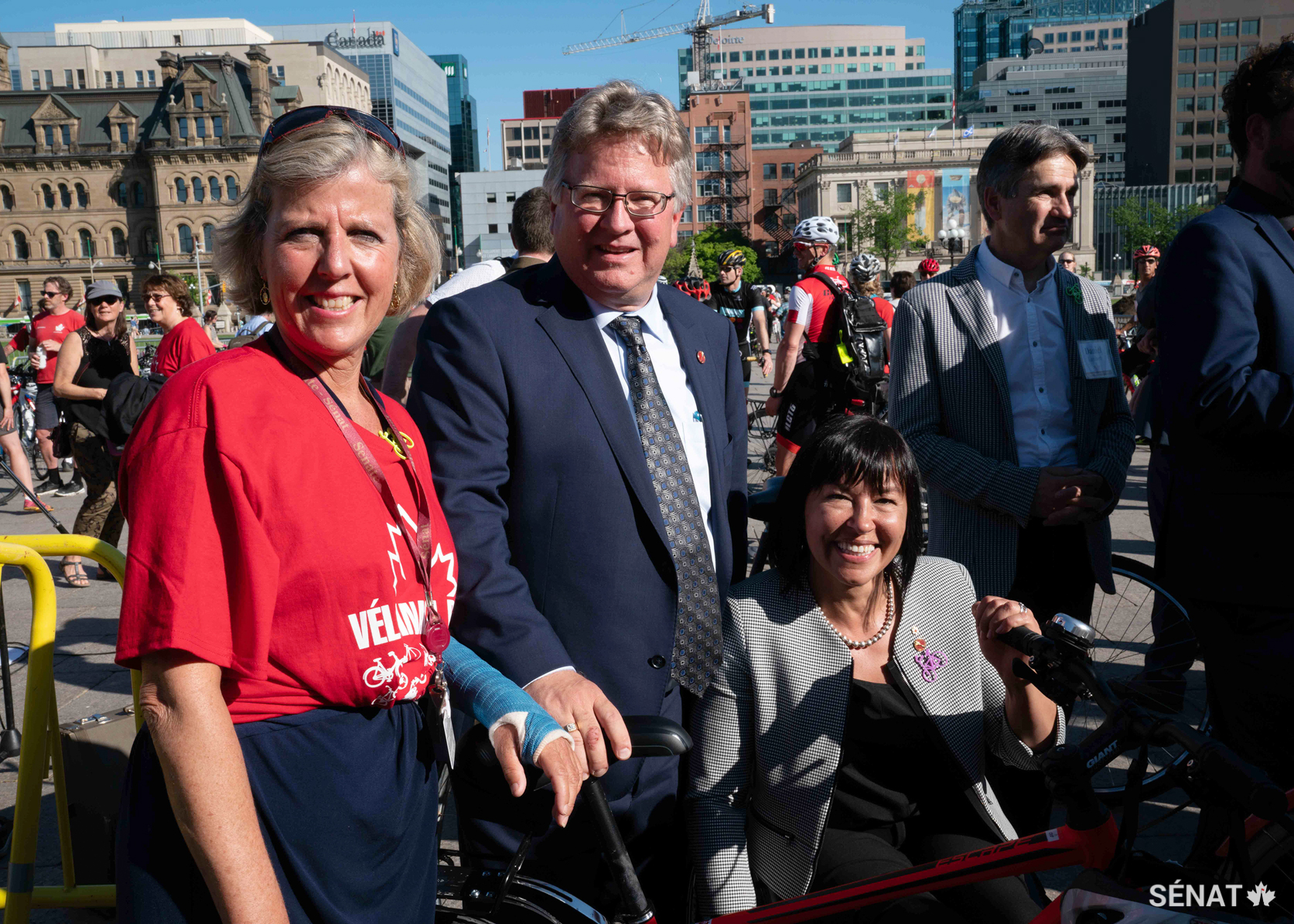 Le mercredi 30 mai – Les sénateurs mènent un groupe de parlementaires, de leaders communautaires et de cyclistes pour une randonnée interprovincial de 6 km autour la capitale nationale à l’occasion de la Journée du vélo sur la Colline. Sur la photo, de gauche à droite, les sénateurs Marty Deacon, Robert Black et Chantal Petitclerc.