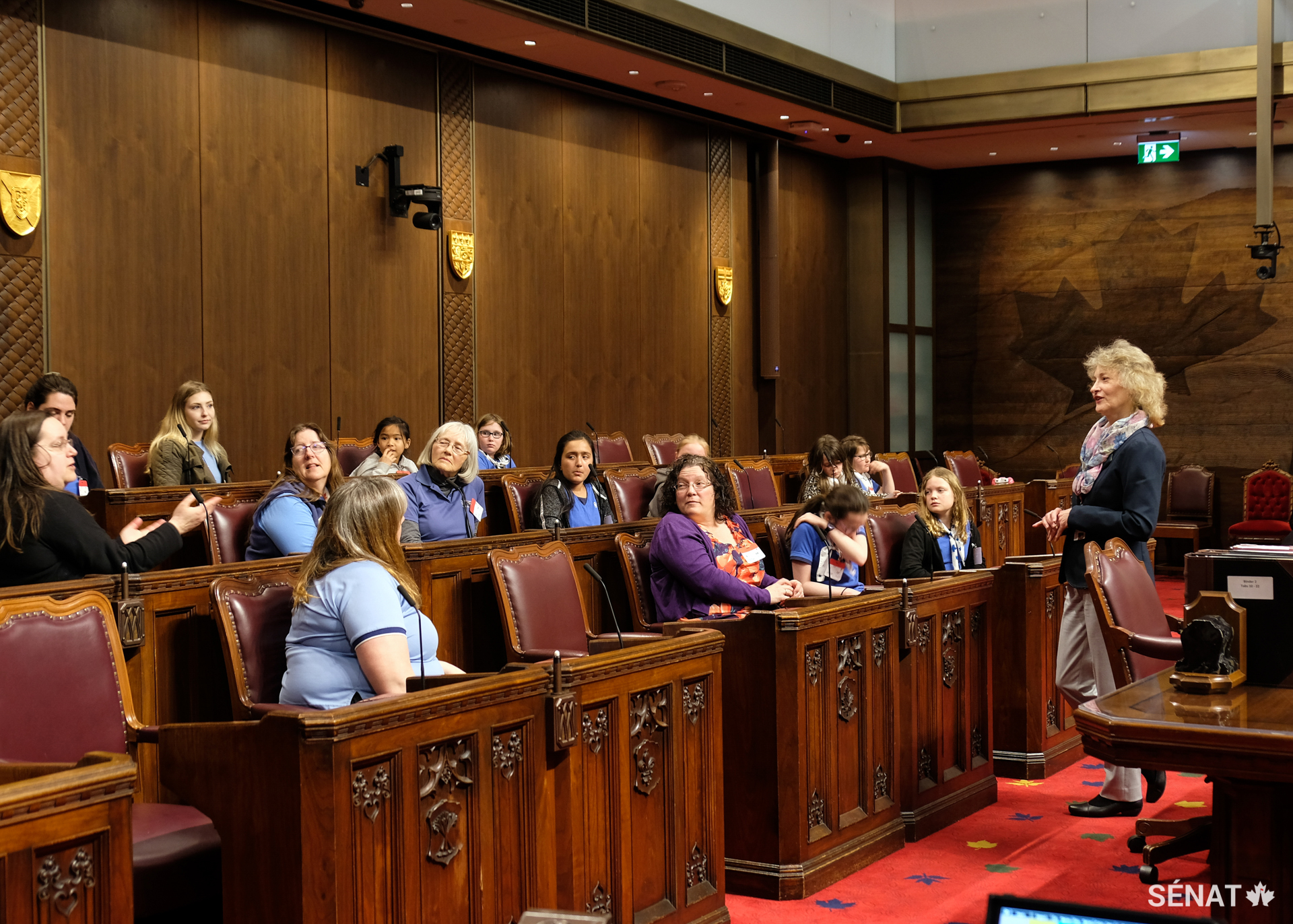 Le mercredi 1er mai 2019 – La sénatrice Pat Duncan converse avec un groupe de Guides dans la Chambre du Sénat. Elle a parlé du rôle du Sénat et de son propre cheminement qui l’a amenée à devenir sénatrice. Cette activité s’est déroulée dans le cadre de SENgage.