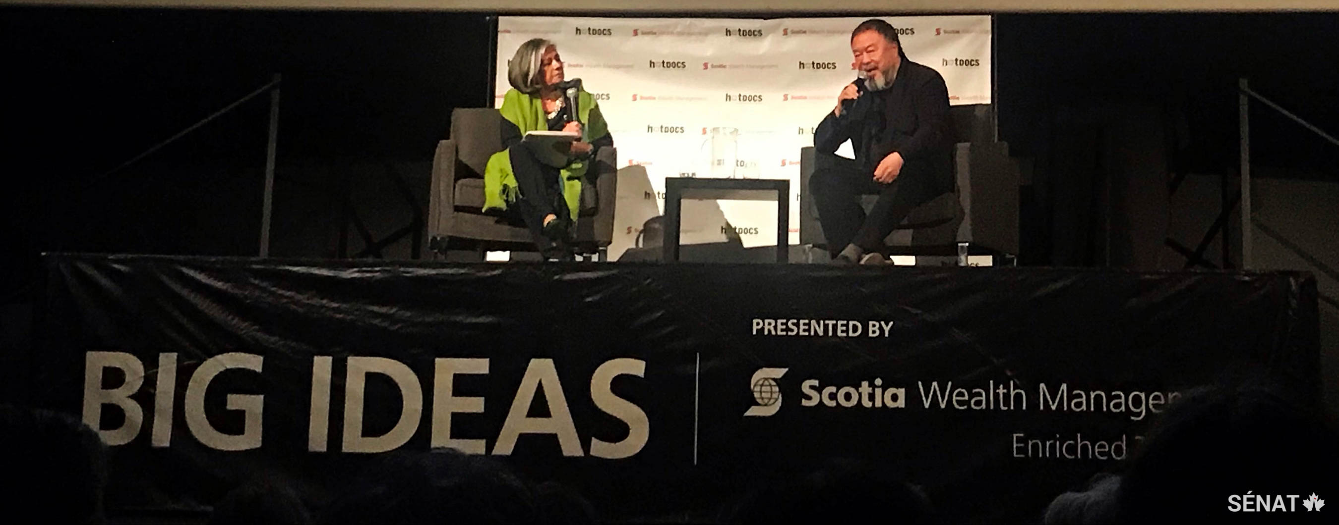 Le vendredi 26 avril 2019 – La sénatrice Ratna Omidvar effectue une entrevue avec l’artiste et le cinéaste de réputation mondiale Ai Weiwei à l’occasion du visionnement de son dernier film « The Rest » lors du Festival international canadien du documentaire Hot à Toronto.
