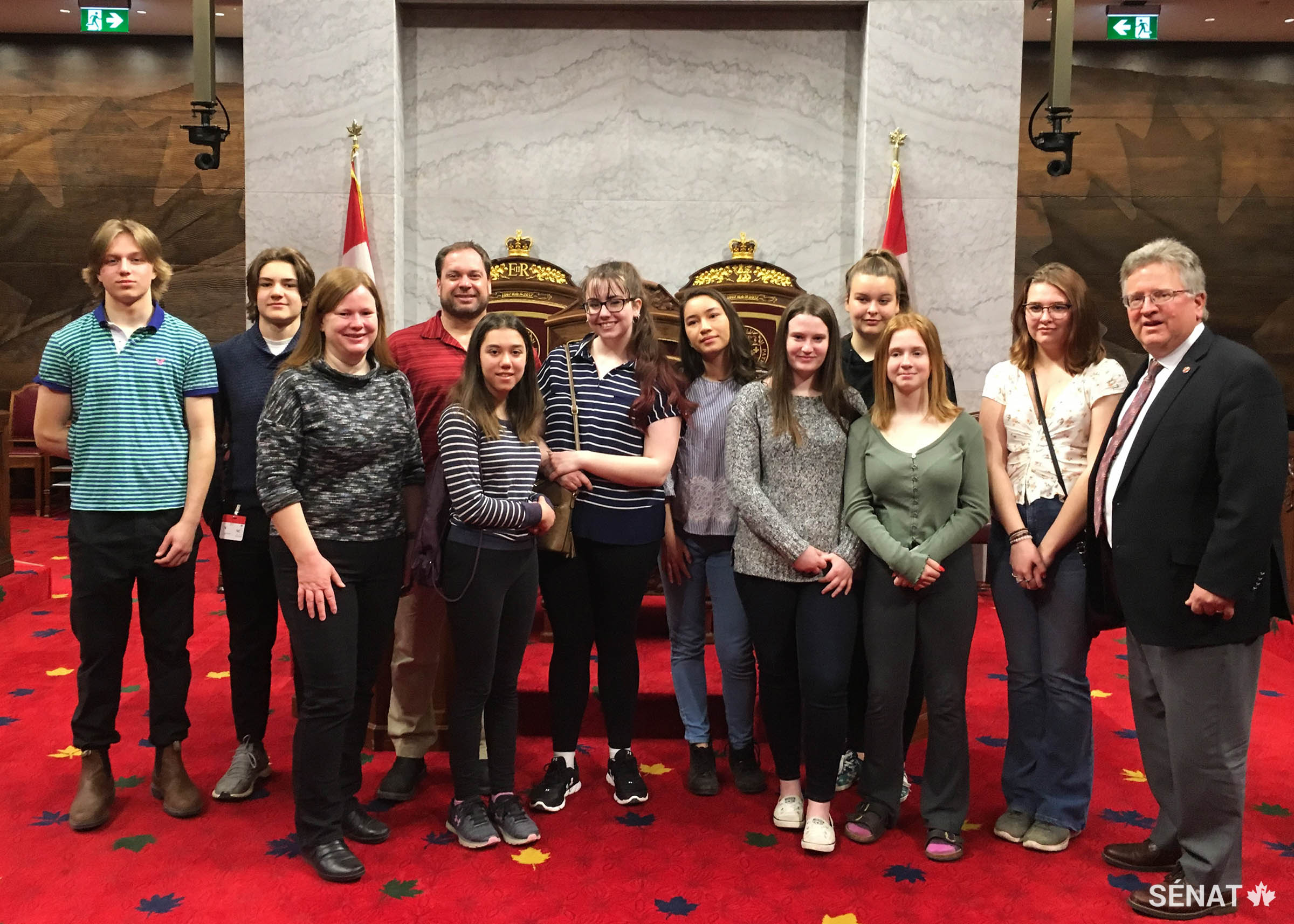 Le mardi 30 avril 2019 – Le sénateur Rob Black accueille un groupe d’étudiants de l’école secondaire du Centre Wellington District à la Chambre du Sénat. Il a notamment parlé du rôle du Sénat dans la démocratie parlementaire du Canada.