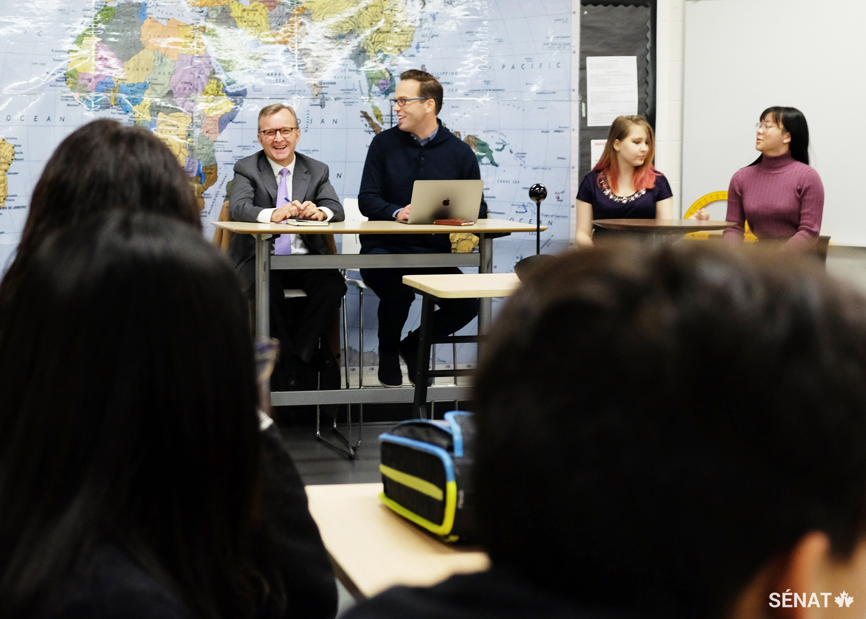 Le jeudi 14 novembre 2019 — Le sénateur Grant Mitchell rencontre simultanément des élèves de cinq écoles, de l’Alberta au Nouveau-Brunswick, dans le cadre d’une assemblée virtuelle organisée par le Centre pour l’éducation mondiale.