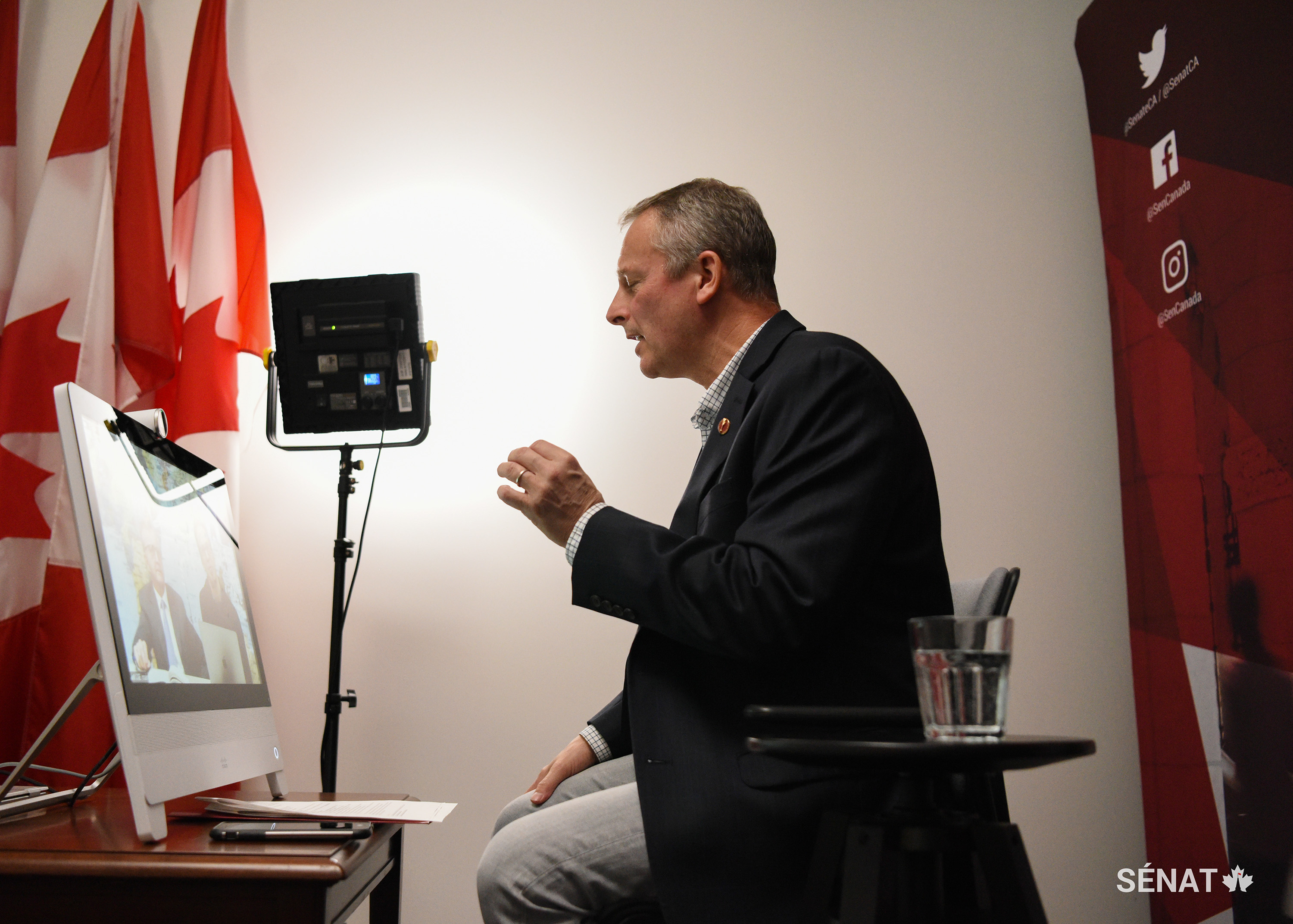 Le jeudi 14 novembre 2019 — Le sénateur David Wells discute du rôle du Sénat avec des étudiants de différentes régions du pays, de l’Alberta au Nouveau-Brunswick, dans le cadre d’une assemblée publique virtuelle organisée par le Centre pour l’éducation mondiale.