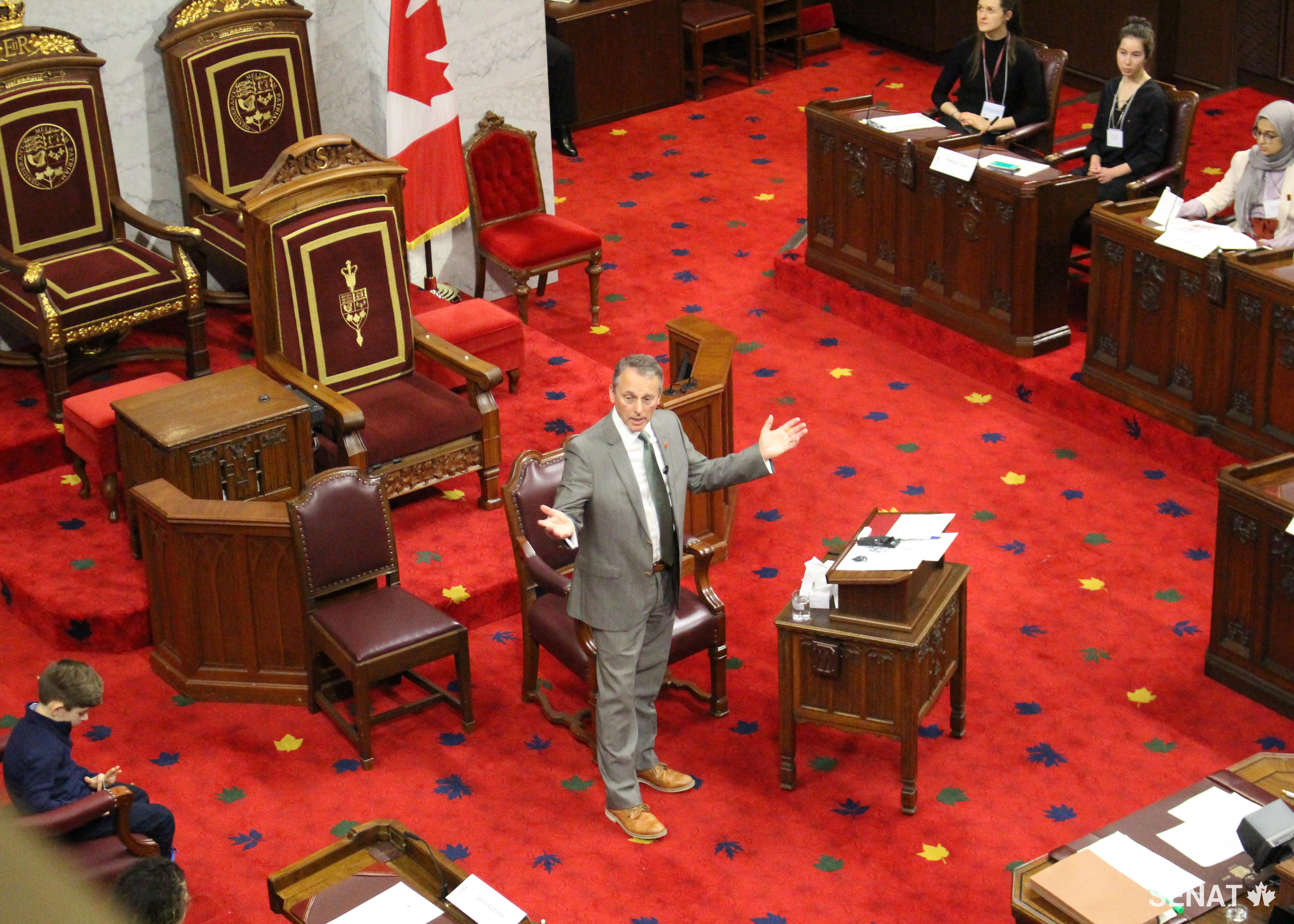 Le samedi 25 janvier 2020 – Le sénateur David M. Wells explique aux participants de la simulation du Sénat comment les sénateurs représentent le Canada sur la scène mondiale.