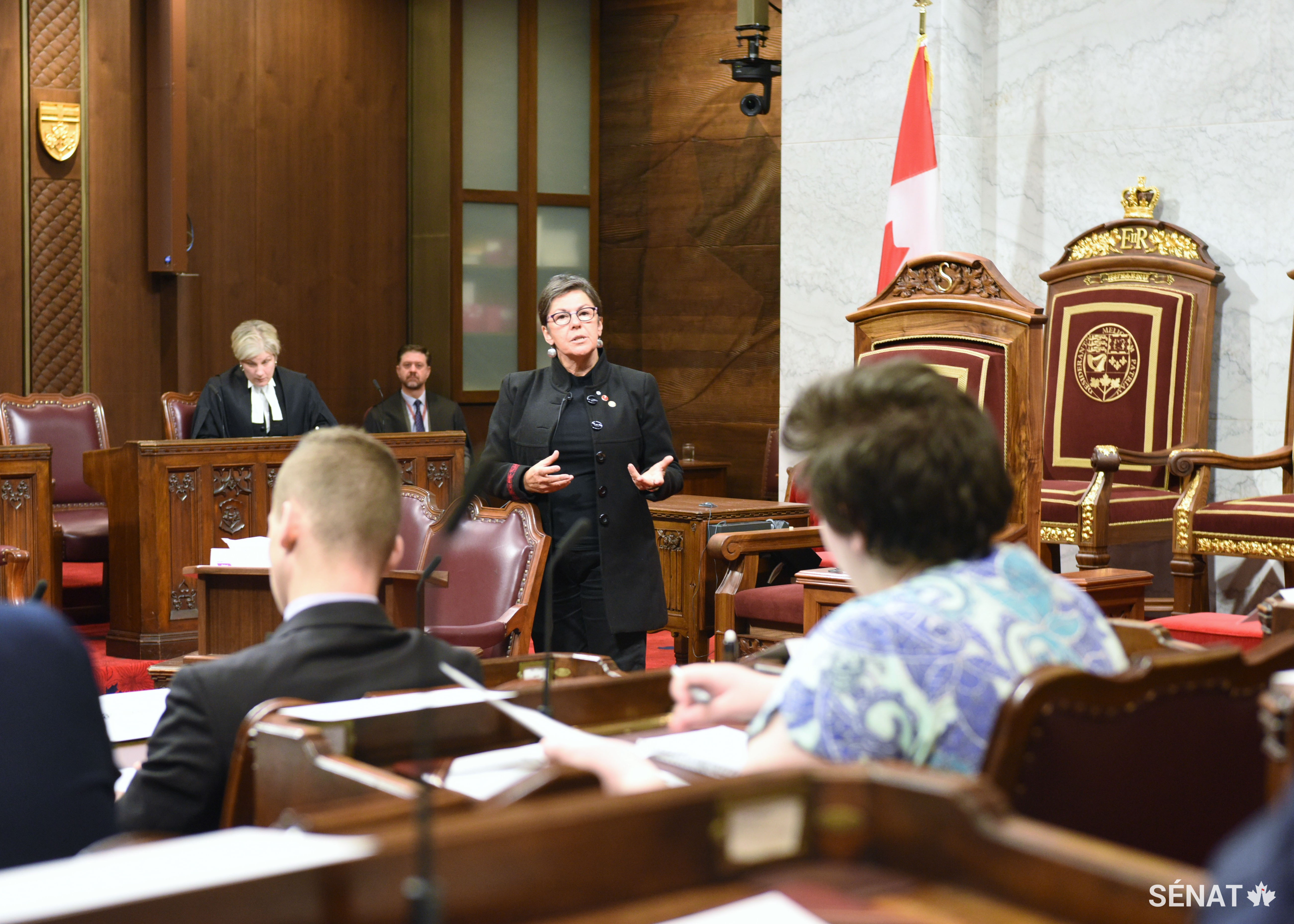 Le dimanche 26 janvier 2020 – La sénatrice Kim Pate parle aux participants de la simulation du Sénat des missions d’étude qu’elle a effectuées pour étudier les conditions de vie dans les prisons du Canada.