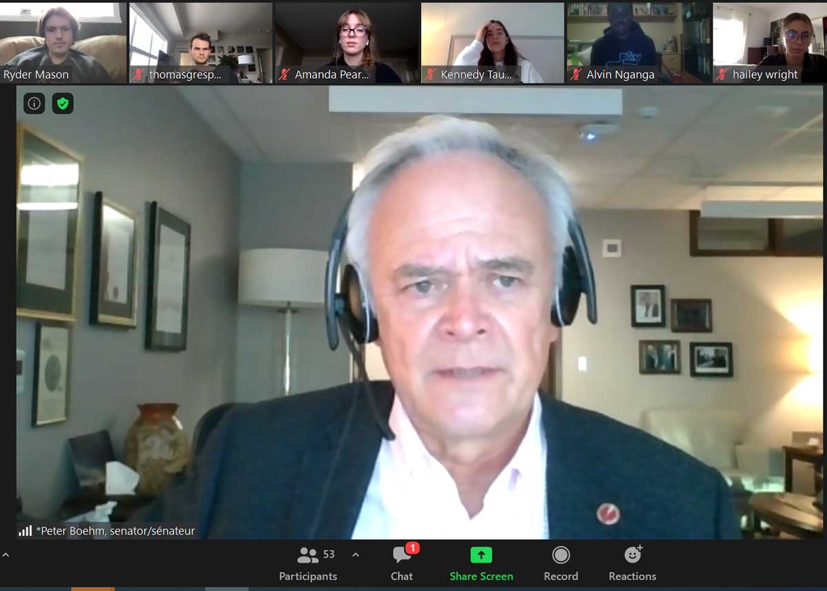 Le vendredi 23 octobre 2020 – Diplomate de carrière et ancien agent du service extérieur, le sénateur Peter M. Boehm explique pourquoi la politique mondiale est importante à plus de 50 étudiants inscrits à un cours relié à ce sujet sur le campus Okanagan de l’Université de la Colombie-Britannique.