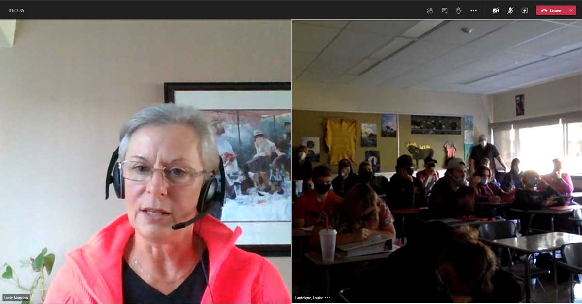 Le mardi 13 octobre 2020 — La sénatrice Lucie Moncion donne un compte rendu du travail des sénateurs lors d’une réunion virtuelle avec une classe d’éducation civique de 10e année de l’École secondaire catholique Franco-Cité de Sturgeon Falls, en Ontario.