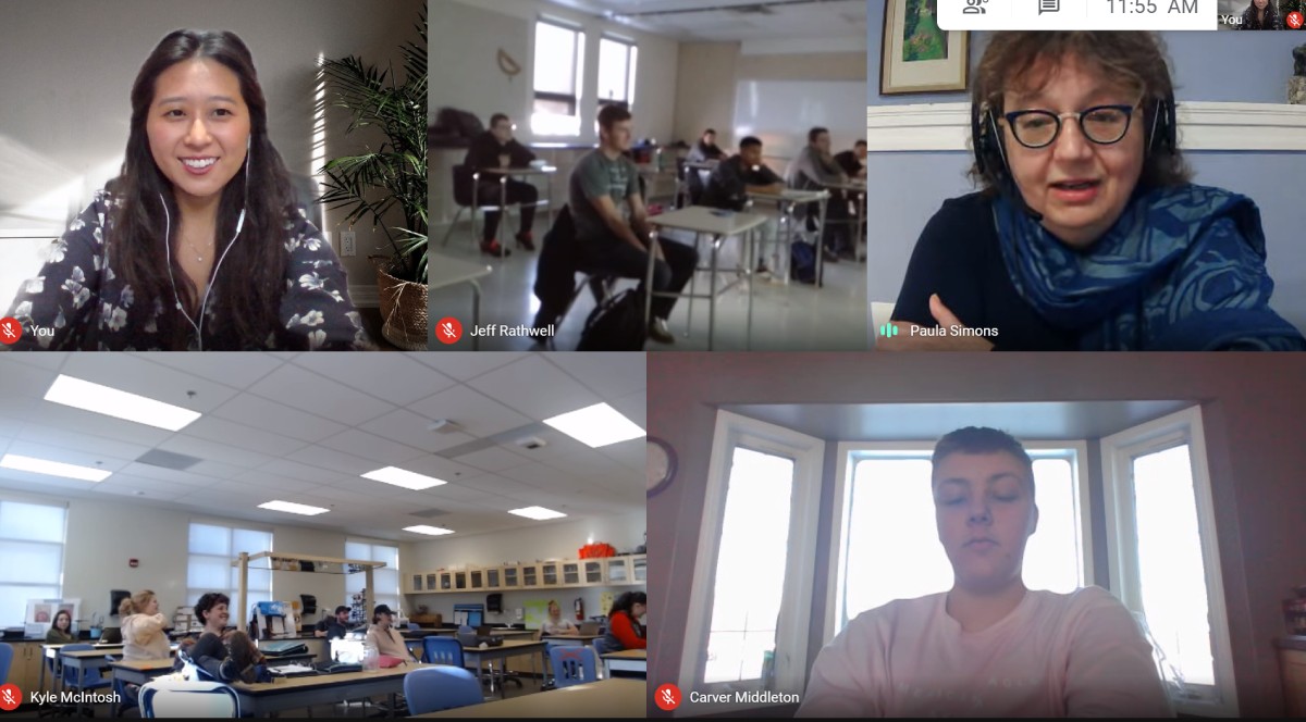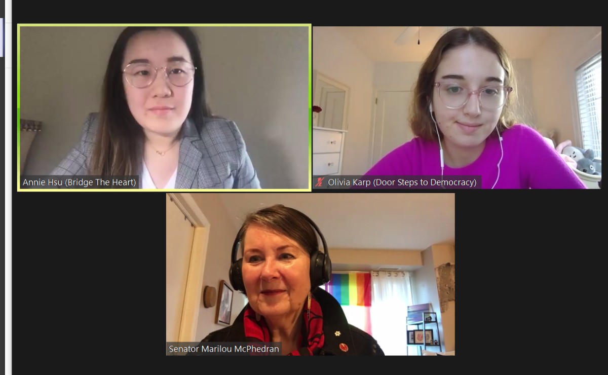 Le samedi 28 novembre 2020 – La sénatrice Marilou McPhedran discute, par l’entremise de la plateforme Zoom, avec des membres d’organisations torontoises dirigées par des jeunes, à savoir Bridge the Heart et Door Steps to Democracy, de ce qui l’a menée au Sénat et de l’importance de s’engager sur le plan civique.