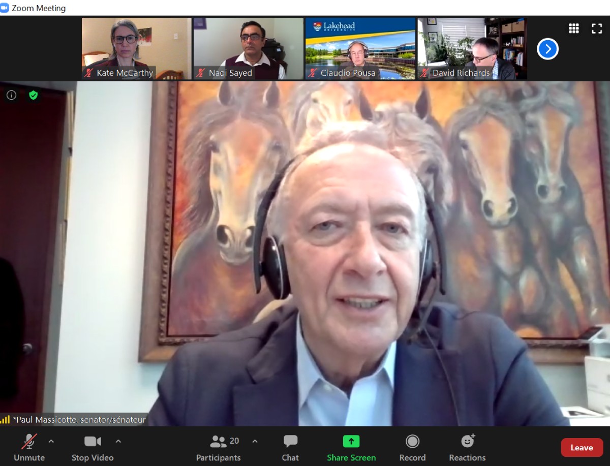 Le mercredi 25 novembre 2020 – Le sénateur Paul J. Massicotte participe à une discussion sur la gouvernance d’entreprise moderne avec la Faculté d’administration des affaires de l’Université Lakehead.