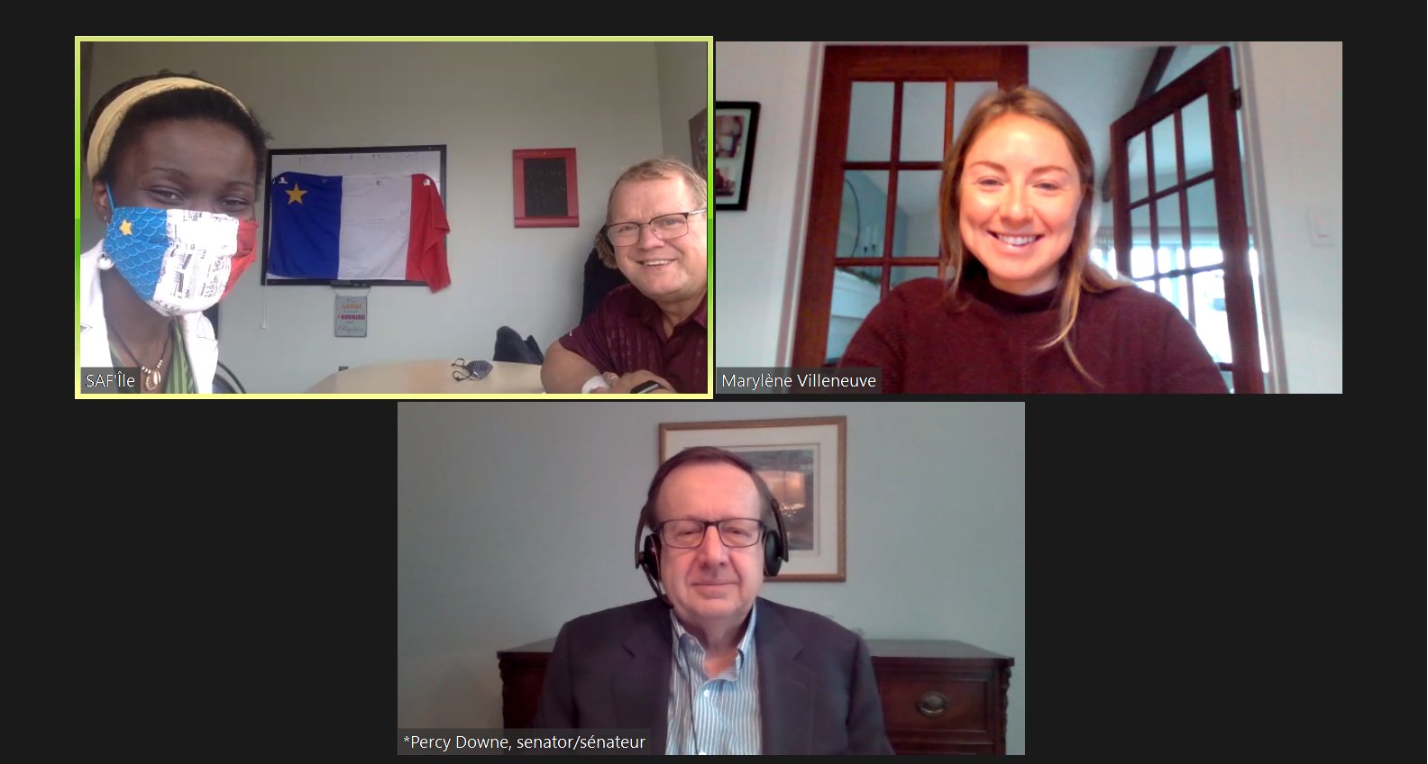 Le mardi 8 décembre 2020 – Le sénateur Percy E. Downe parle à Isabelle Dasylva-Gill et à Edgar Arsenault, de la Société acadienne et francophone de l’Île-du-Prince-Édouard, des services en français à l’Île-du-Prince-Édouard et de la modernisation de la Loi sur les langues officielles.