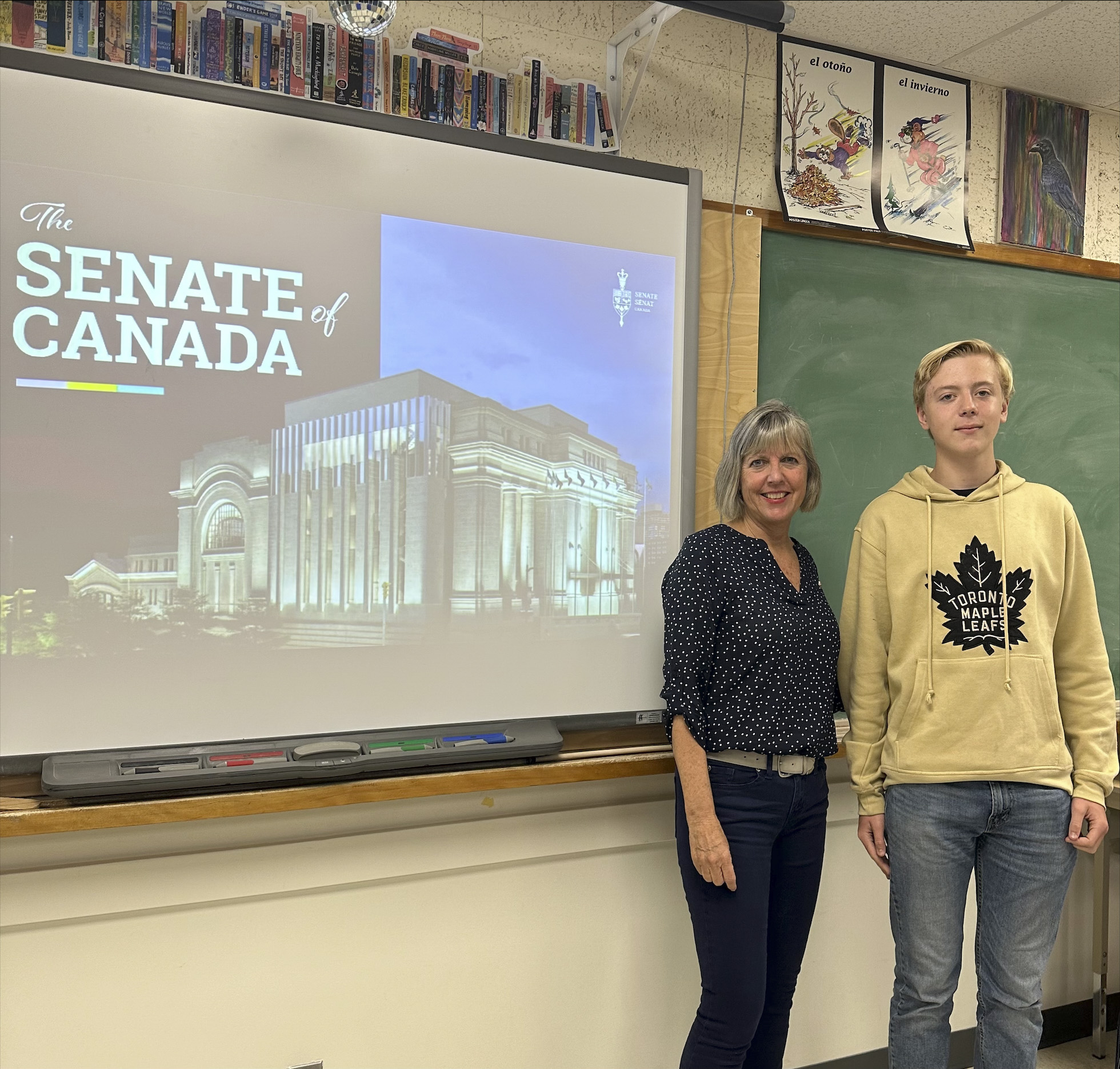 Le vendredi 27 octobre 2023 – La sénatrice Marty Deacon; rencontre coordonnée par S’ENgage avec des étudiants; John J. Ross Collegiate Vocational Institute, Guelph, Ontario.