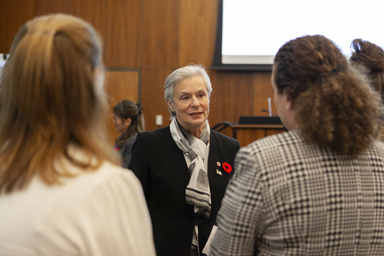 Le vendredi 13 octobre 2023 – La sénatrice Paula Simons, deuxième à gauche, première rangée; rencontre avec des étudiants en sciences politiques; Université de l’Alberta, Edmonton, Alberta.
