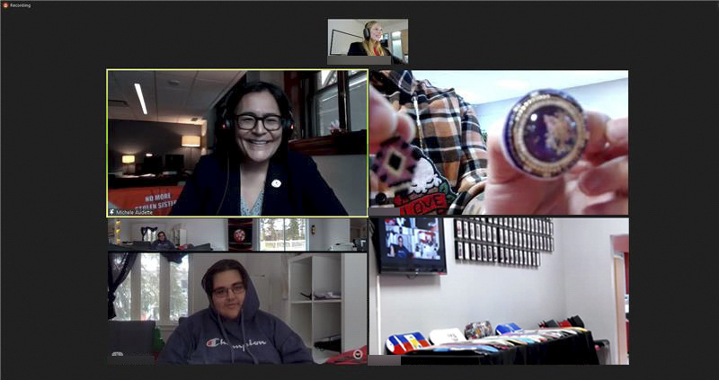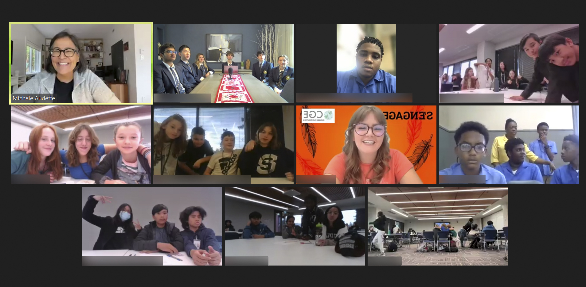 Le jeudi 9 novembre 2023 – La sénatrice Michèle Audette, coin supérieur à gauche; rencontre virtuelle avec des étudiants de l’institution Kiuna à Odanak, au Québec, organisée par S’ENgage.