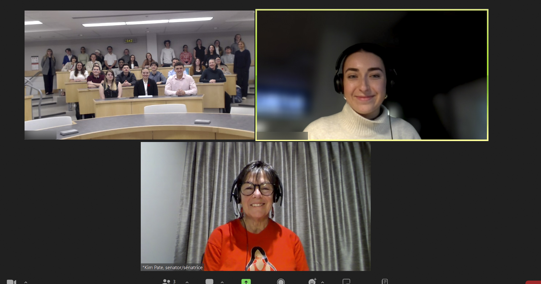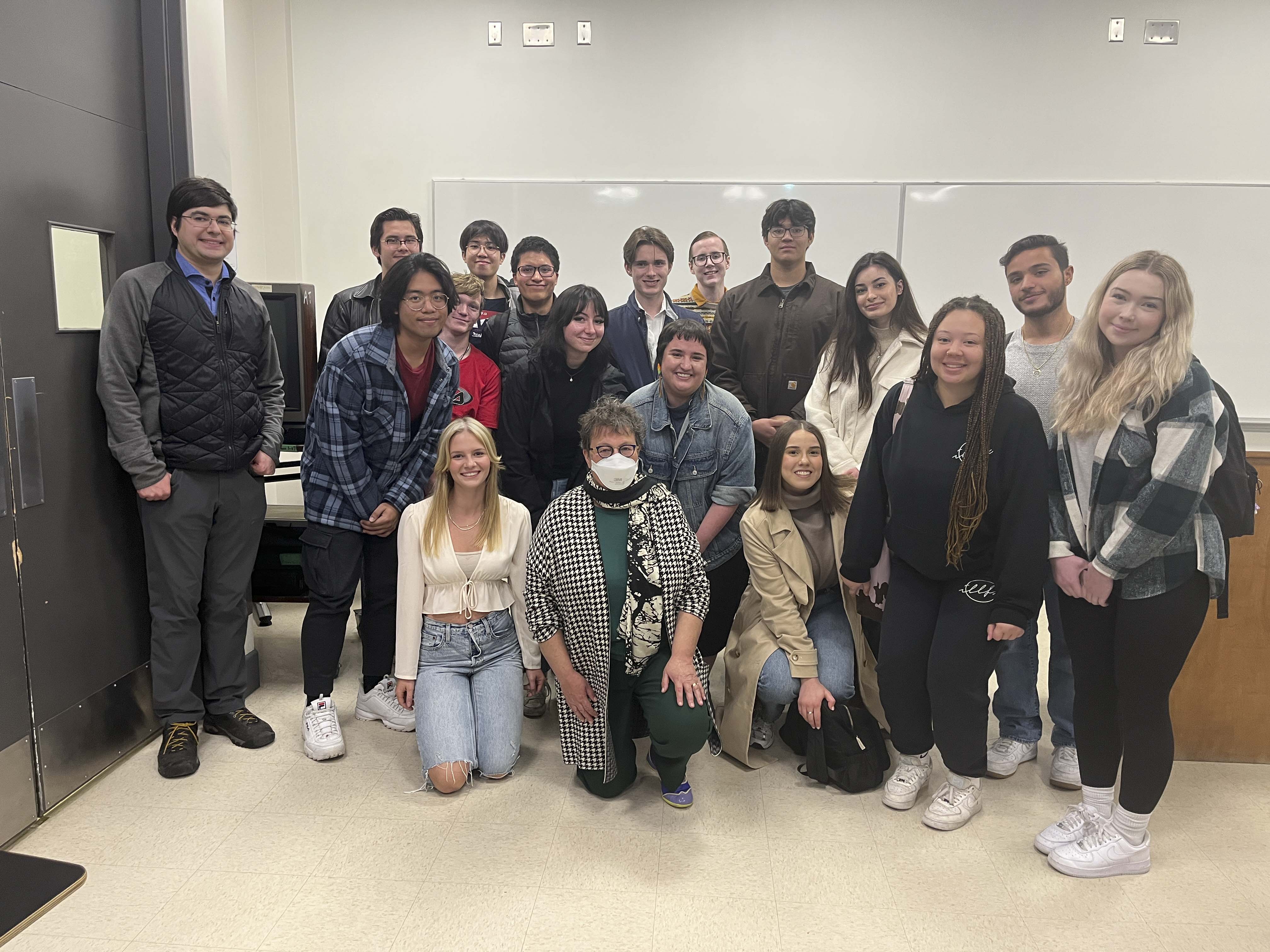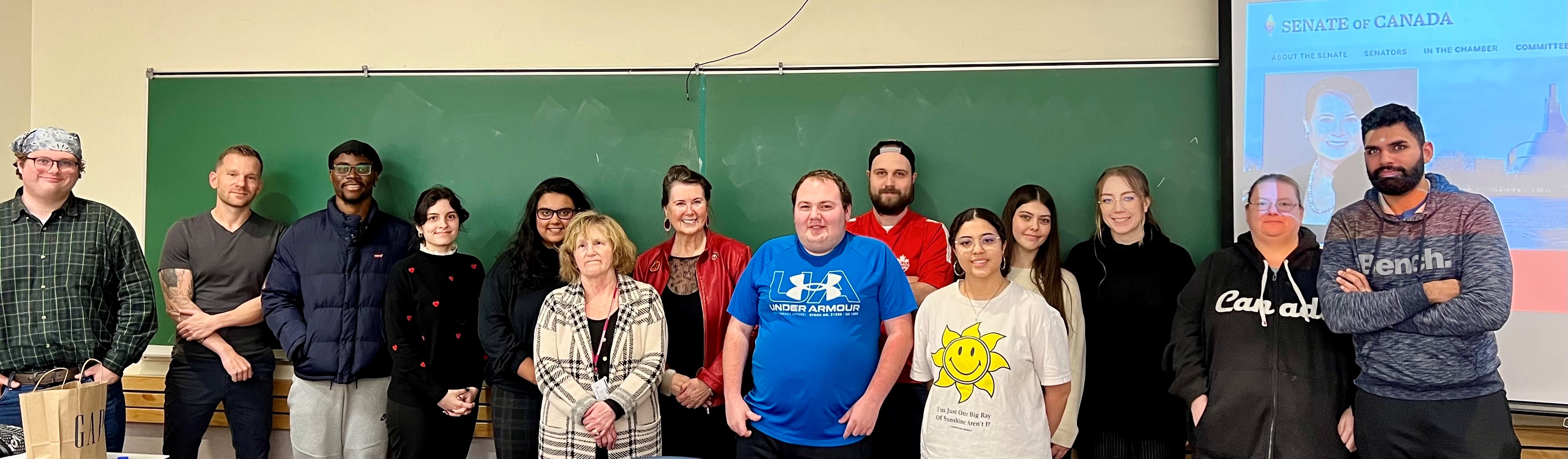 Le jeudi 2 novembre 2023 – La sénatrice Marilou McPhedran, arrière centre, conférencière invitée à un cours de politique mondiale, organisé par S’ENgage; Université de Winnipeg, Winnipeg, Manitoba.