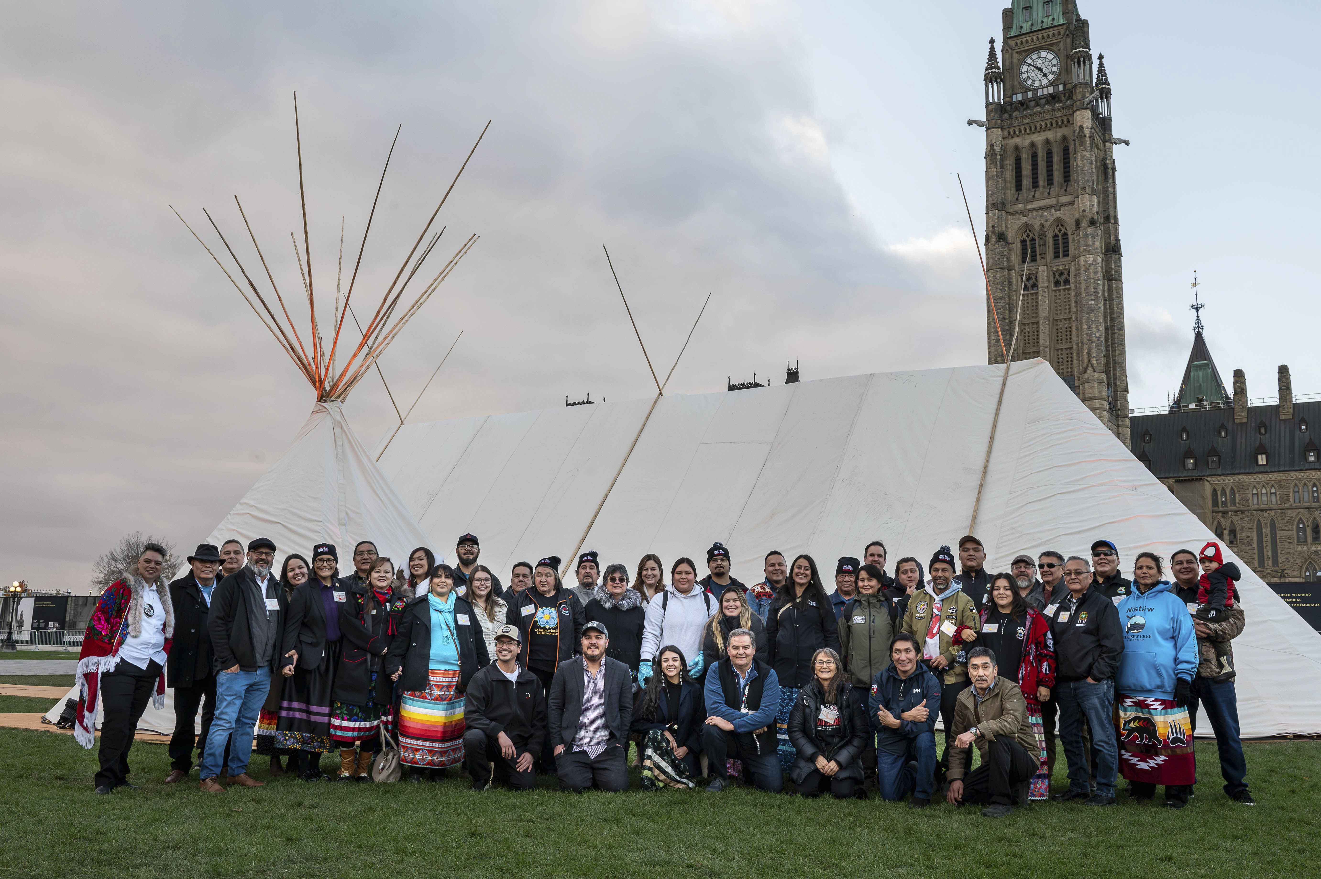 Le mercredi 1er novembre 2023 – La sénatrice Michèle Audette, sixième à partir de la gauche; célébration traditionnelle dans un shaputuan innu (tente de rassemblement), organisée par la sénatrice Audette et l’Indigenous Leadership Initiative, pour honorer le travail des Gardiens autochtones; Colline du Parlement, Ottawa, Ontario. Crédit photo : Indigenous Leadership Initiative