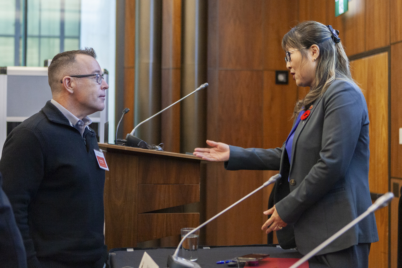 Le lundi 30 octobre 2023 – La sénatrice Yonah Martin, à droite; rencontre avec des enseignants lors du panel des parlementaires dans le cadre du Forum des enseignants, coordonnée par la Bibliothèque du Parlement et S’ENgage; Ottawa, Ontario. Crédit photo : J. Harrington/Icon Imaging