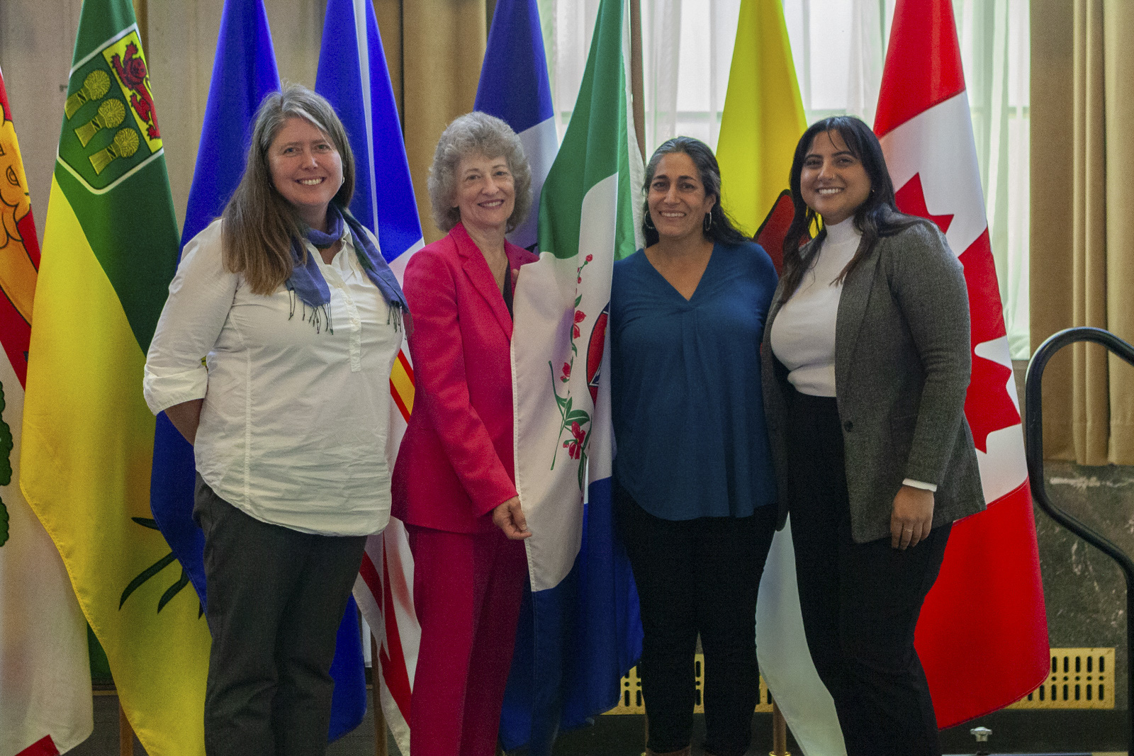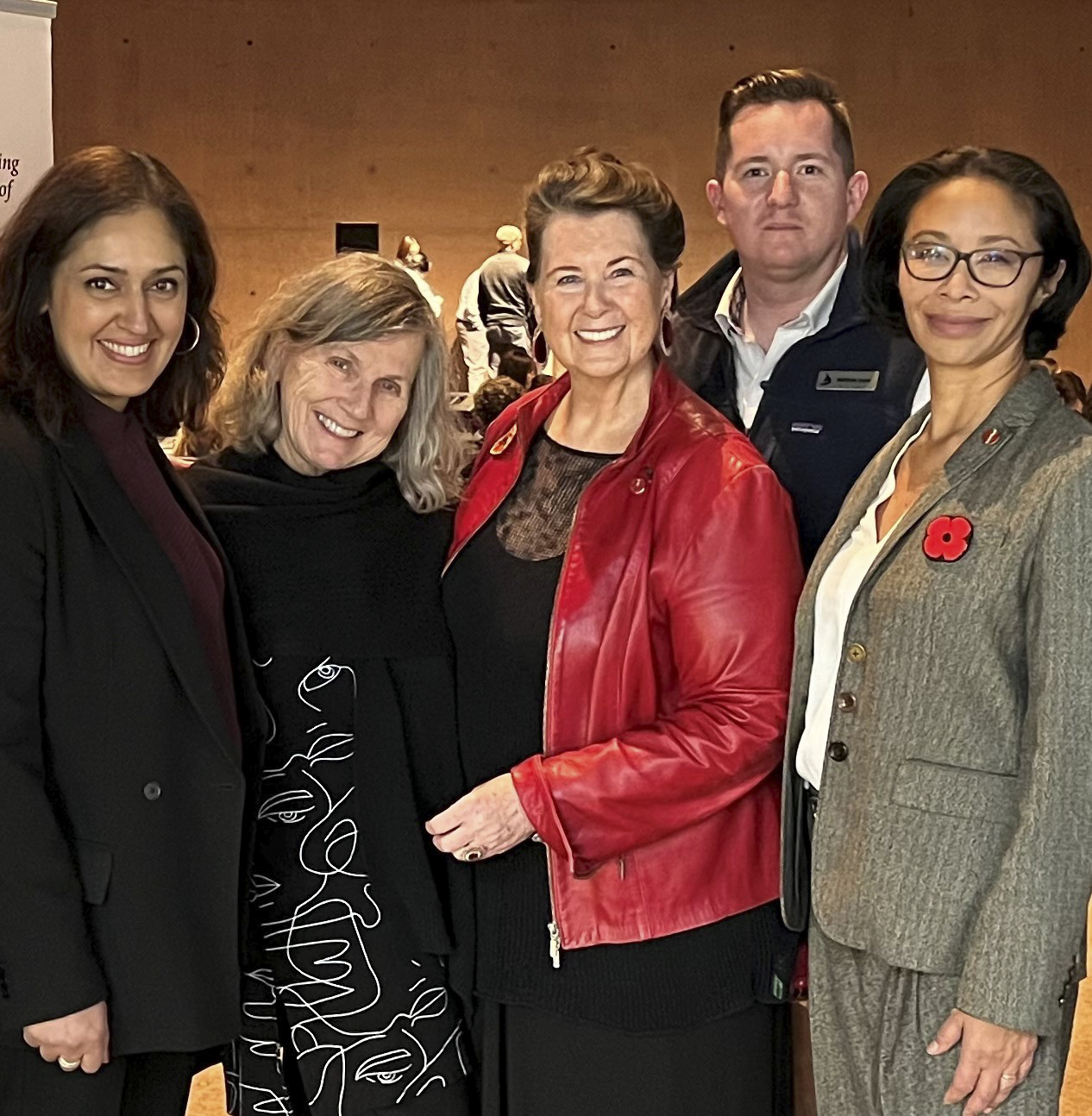 Le vendredi 3 novembre 2023 – De gauche à droite : Isha Khan, PDG du Musée canadien des droits de la personne (MCDP), Estelle Lamoureux, éducatrice en droits de la personne, la sénatrice Marilou McPhedran, Matthew Cutler, vice-président du MCDP, et la sénatrice Flordeliz (Gigi) Osler; la sénatrice McPhedran en tant qu’oratrice principale du Sommet annuel des jeunes sur la paix nucléaire; Musée canadien des droits de la personne, Winnipeg, Manitoba.