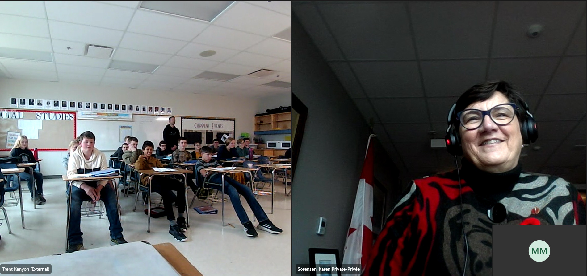 Le mercredi 1er novembre 2023 – La sénatrice Karen Sorensen; conférence virtuelle, coordonnée par S’ENgage, avec des élèves de l’École Buffalo Head Prairie, La Crête, Alberta.