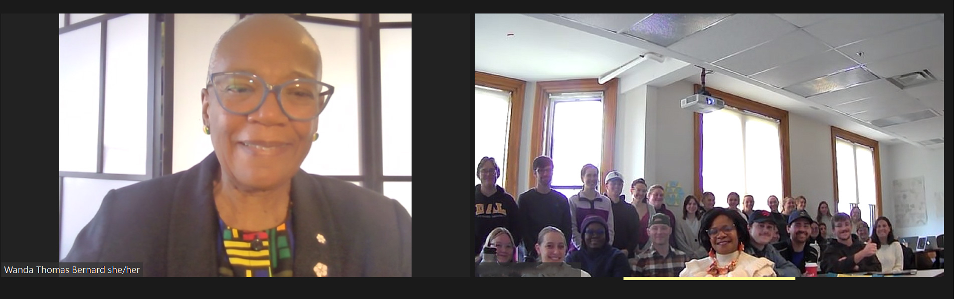 Le mardi 14 novembre 2023 – La sénatrice Wanda Thomas Bernard, à gauche; conférencière invitée au cours sur l’équité et l’inclusion scolaire à l’Université Acadia de Wolfville, en Nouvelle-Écosse, événement organisé par S’ENgage.