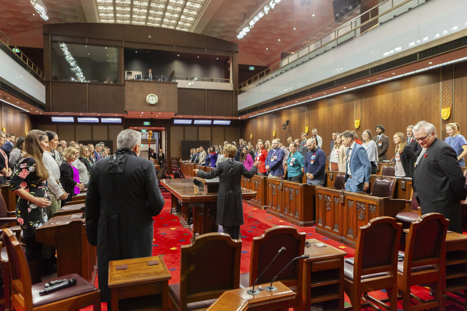 Le jeudi 2 novembre 2023 – La Présidente du Sénat, Raymonde Gagné, au centre; présentation aux enseignants dans le cadre du Forum des enseignants; Chambre du Sénat, Ottawa, Ontario. Crédit photo : J. Harrington/Icon Imaging