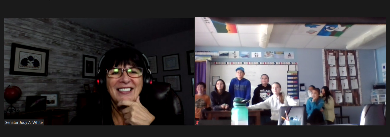 Le mardi 14 novembre 2023 – La sénatrice Judy A. White, à gauche; visite virtuelle de l’École J.C. Erhardt Memorial à Makkovik, à Terre-Neuve-et-Labrador, organisée par S’ENgage.