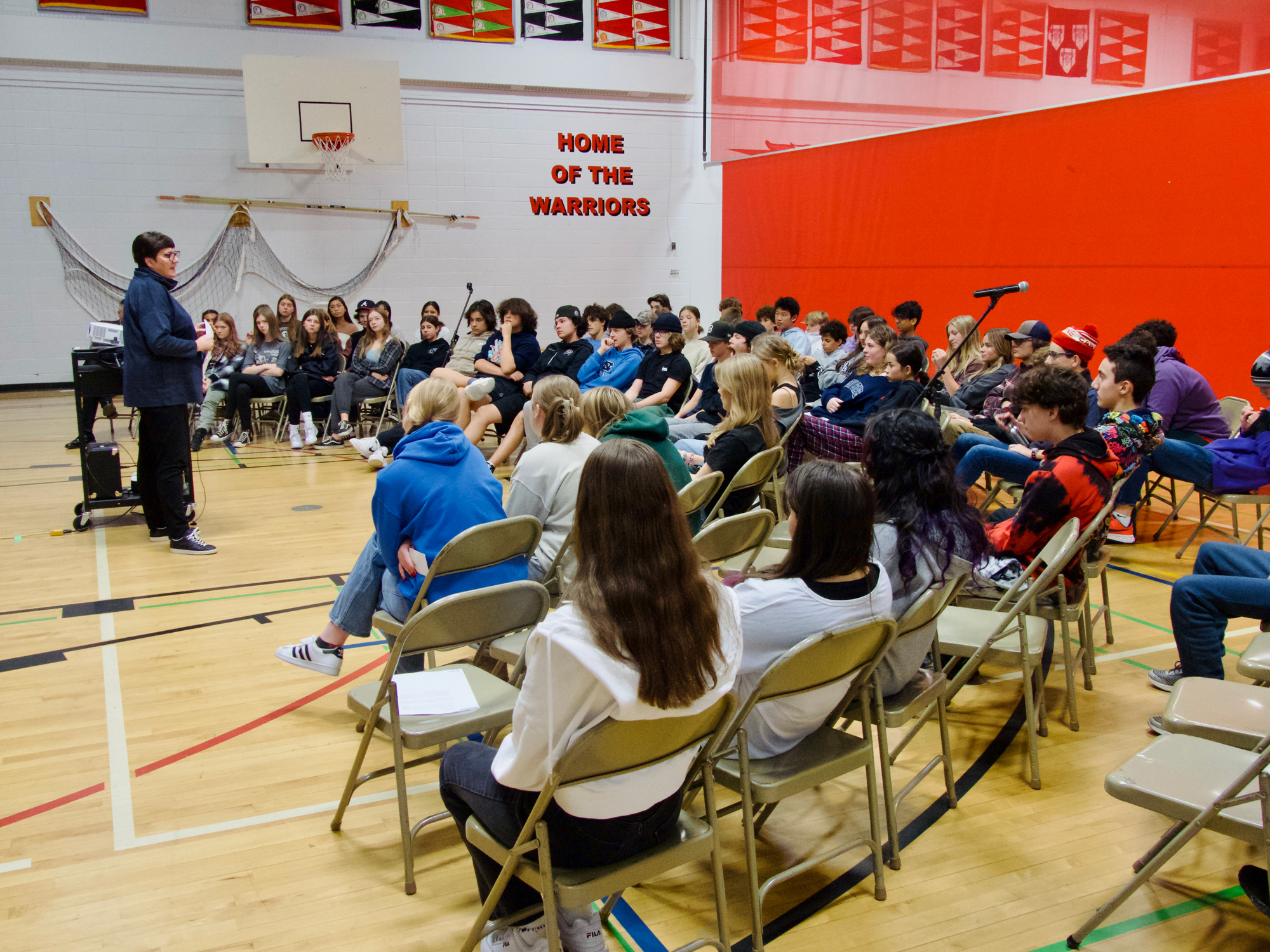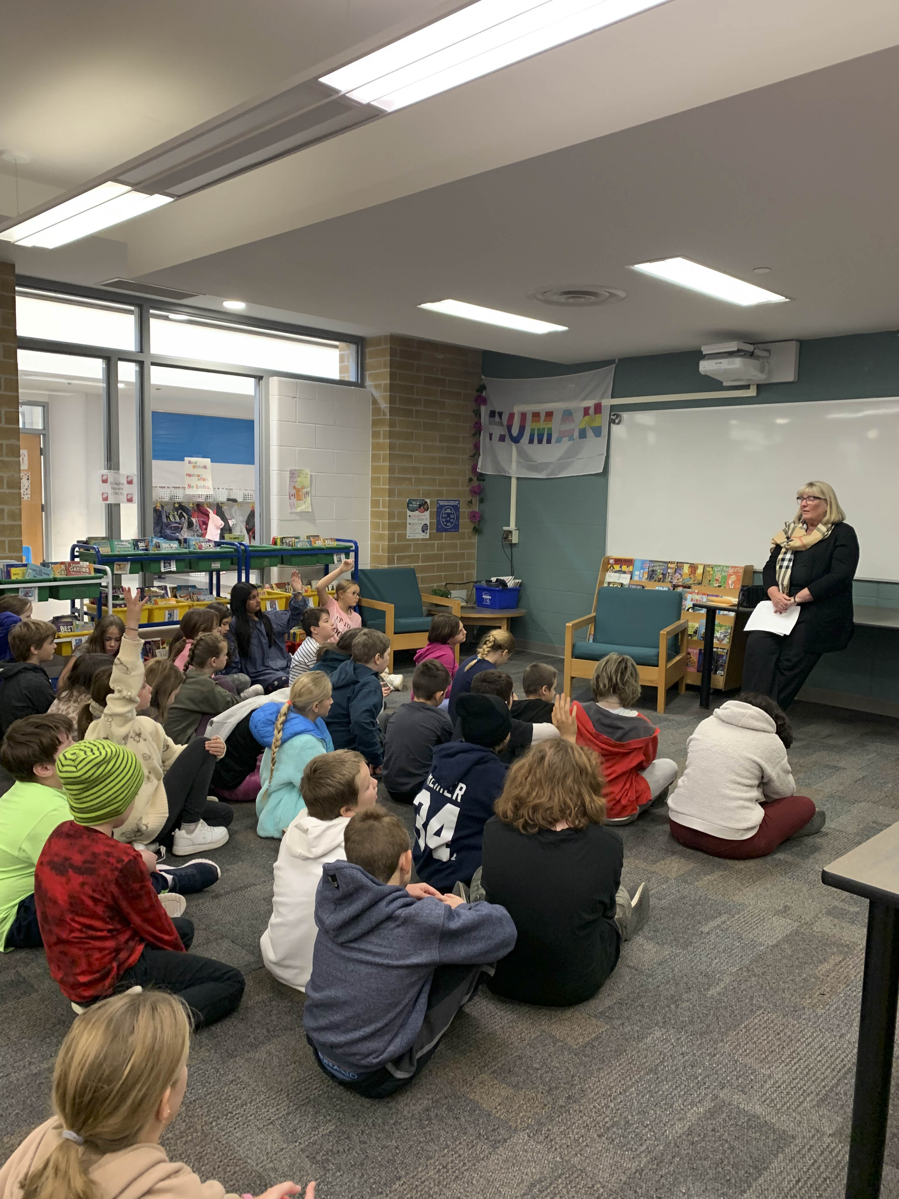 Le vendredi 3 novembre 2023 – La sénatrice Karen Sorensen; conférence pour des élèves, coordonnée par S’ENgage; école Robert Warren, Calgary, Alberta.