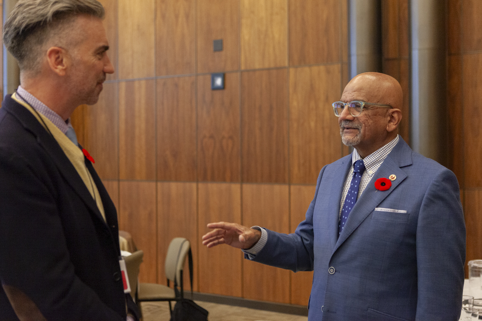 Le lundi 30 octobre 2023 – Le sénateur Andrew Cardozo, à droite; rencontre avec des enseignants lors du panel des parlementaires dans le cadre du Forum des enseignants, coordonnée par la Bibliothèque du Parlement et S’ENgage; Ottawa, Ontario. Crédit photo : J. Harrington/Icon Imaging