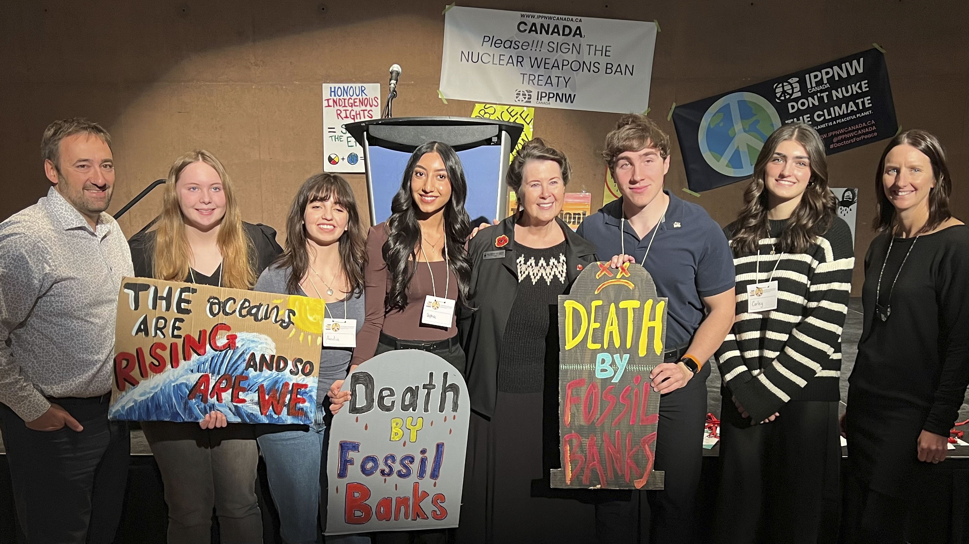 Le vendredi 3 novembre 2023 – La sénatrice Marilou McPhedran, quatrième à partir de la droite, avec des étudiants de l’école secondaire Lord Selkirk Regional Comprehensive; la sénatrice en tant qu’oratrice principale du Sommet annuel des jeunes sur la paix nucléaire; Musée canadien des droits de la personne, Winnipeg, Manitoba.