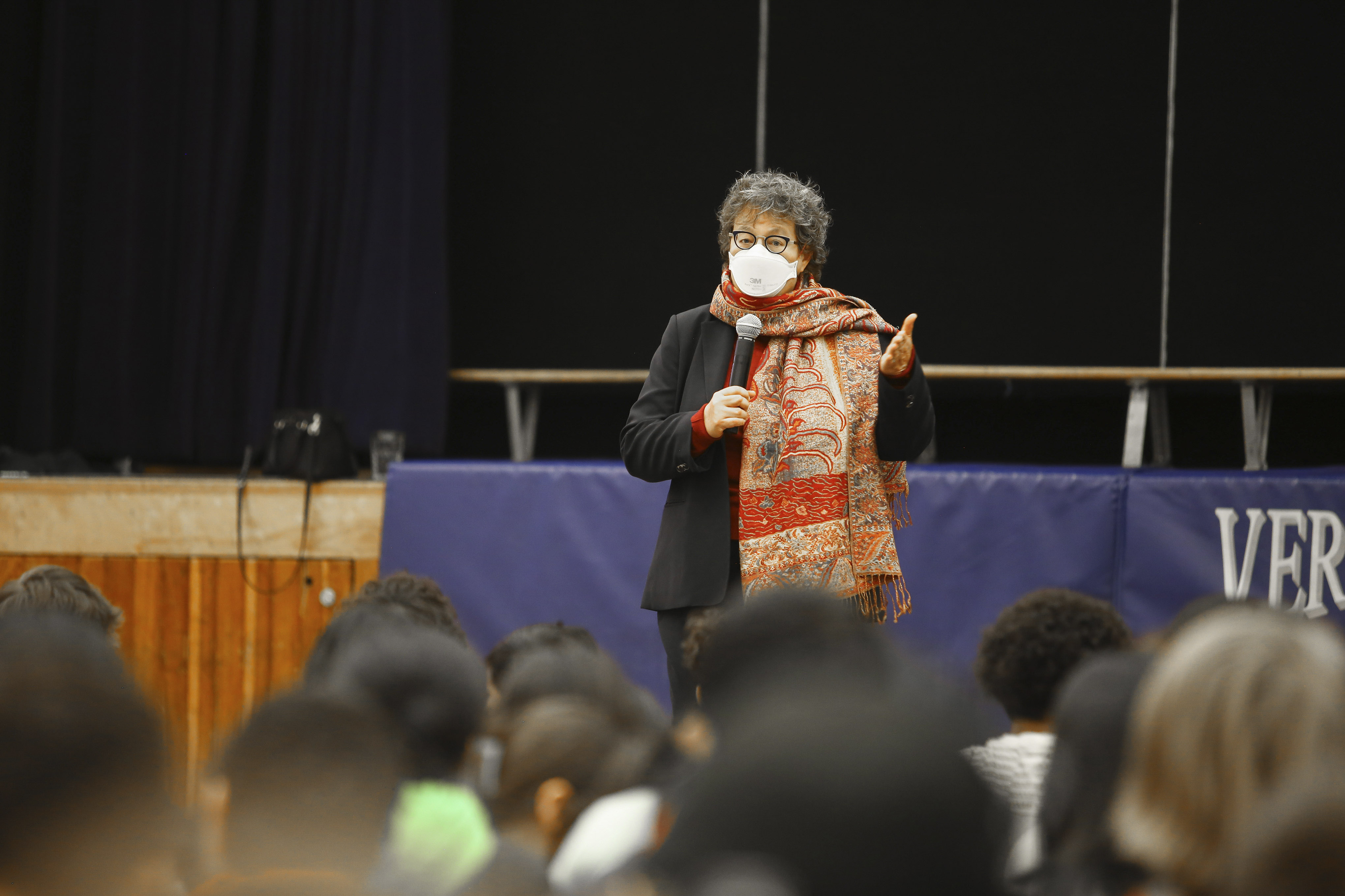 Le vendredi 13 octobre 2023 – La sénatrice Marie-Françoise Mégie; conférence coordonnée par S’ENgage pour lesélèves; École secondaire De Mortagne, Boucherville, Québec.