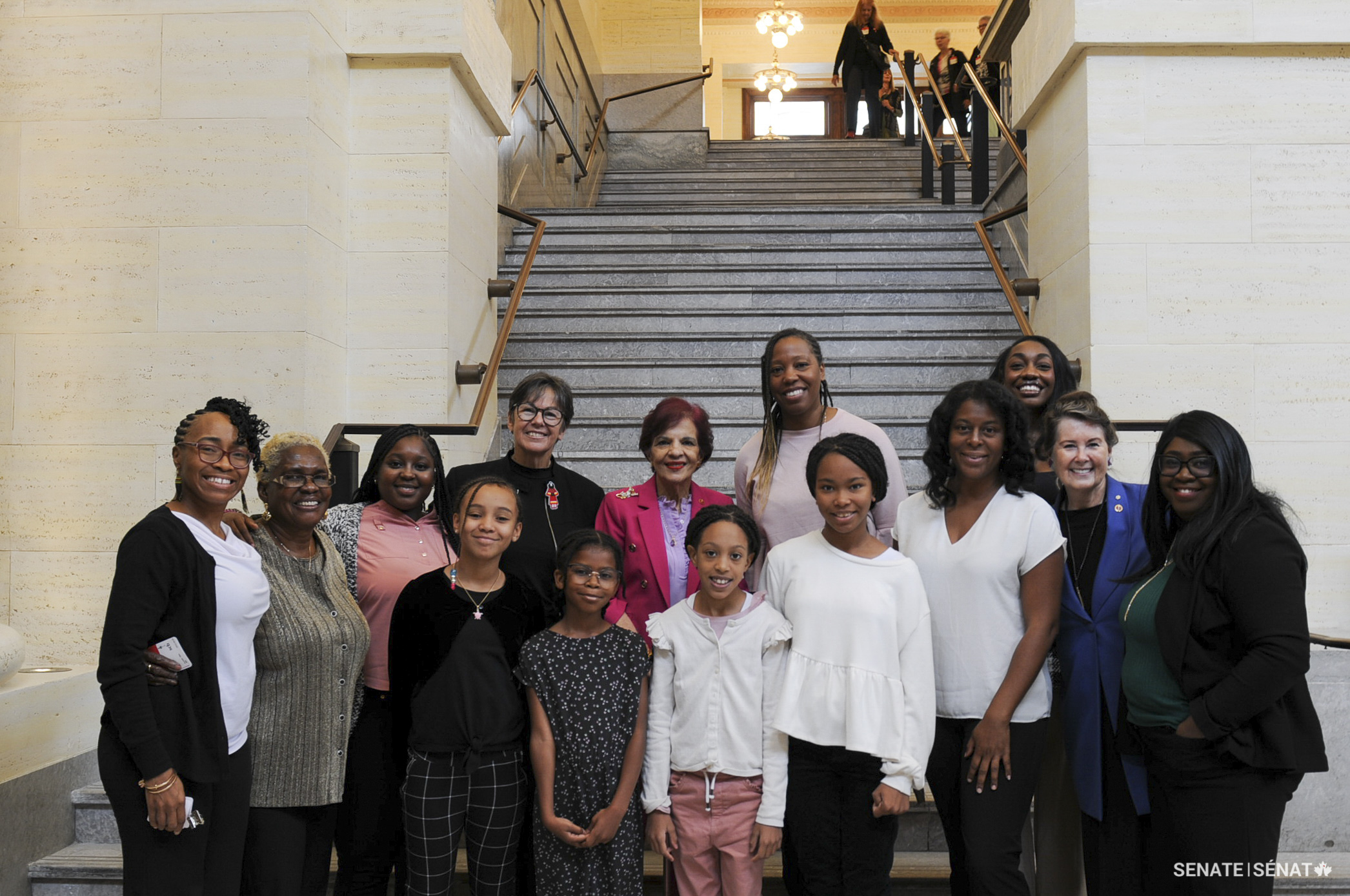 Le mercredi 18 octobre – Les sénatrices Kim Pate et Mobina S.B. Jaffer, rangée arrière, première et deuxième à gauche, et Marilou McPhedran, deuxième à partir de la droite; rencontre organisée par S’ENgage avec Developing Young Leaders of Tomorrow, Today (DYLOTT) dans le cadre du programme #LeadLikeAGirl dans la diplomatie parlementaire. La sénatrice Wanda Thomas Bernard s’est jointe virtuellement (non photographiée); édifice du Sénat du Canada, Ottawa, Ontario.
