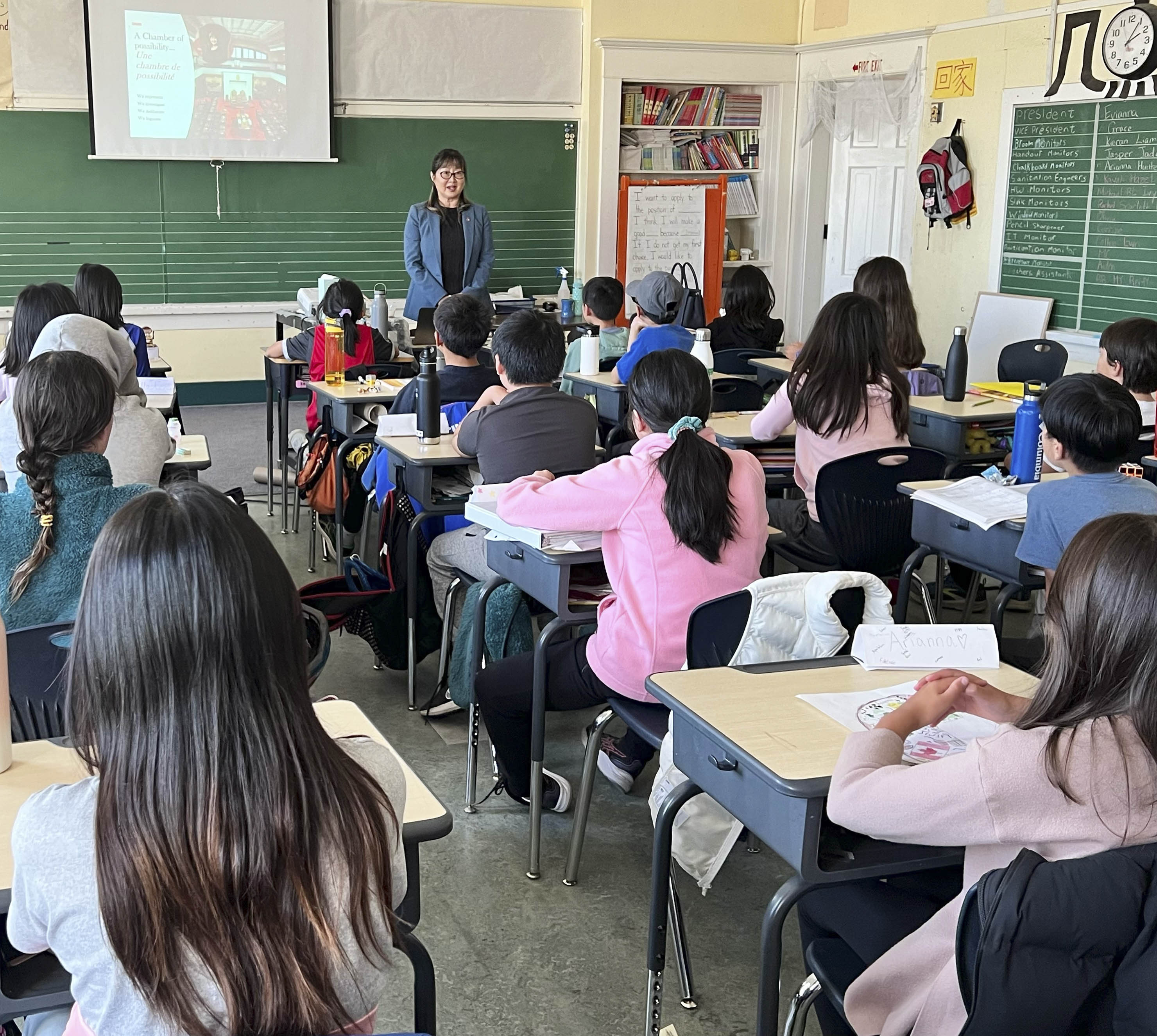Le jeudi 12 octobre 2023 – La sénatrice Yonah Martin; rencontre coordonnée par S’ENgage avec les élèves de 6èmeannée; École John Norquay Elementary, Vancouver, Colombie-Britannique.