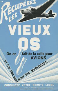 Une affiche de propagande encourage les Canadiens de garder les restes d’os à cuire que l’on peut traiter pour en faire de la colle pour les avions pendant la Deuxième Guerre mondiale. (Crédit photo : Musée canadien de la guerre)