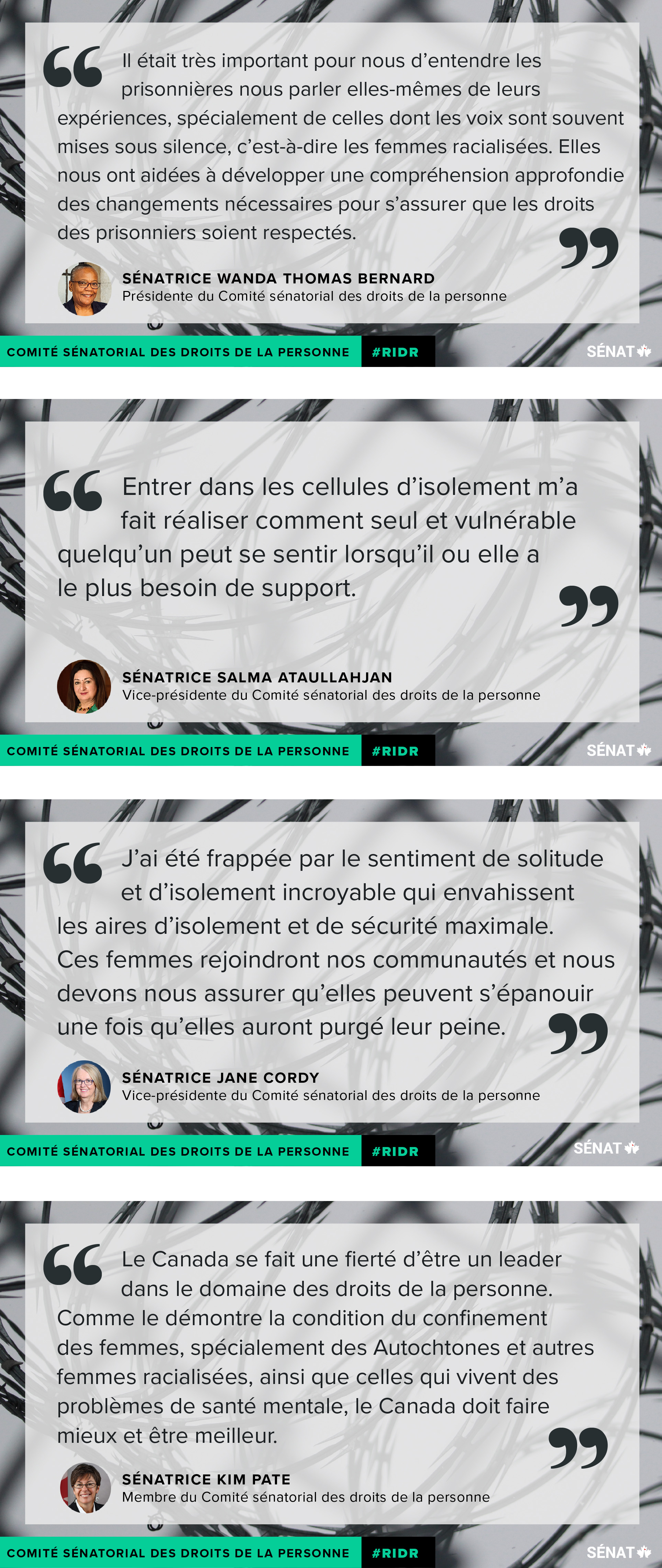 De plus, ce genre de confinement n’est pas limité au secteur d’isolement : les sénatrices se sont entretenues avec des prisonnières placées dans des cellules à sécurité maximale, dans de petites unités, et tenues à l’écart du reste de la population carcérale.