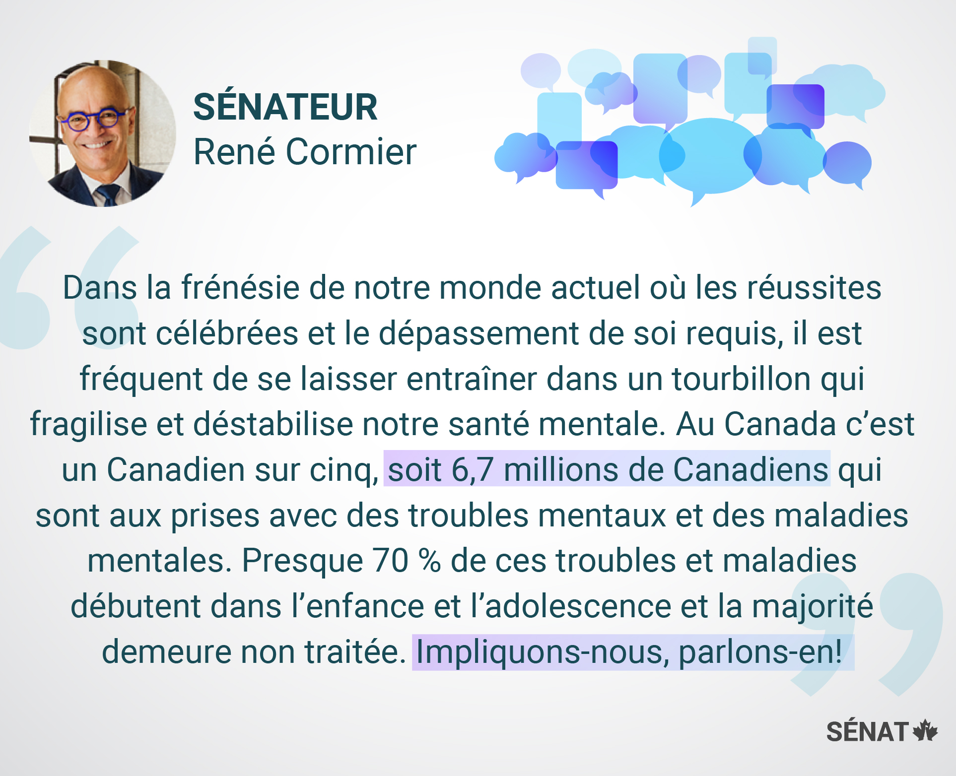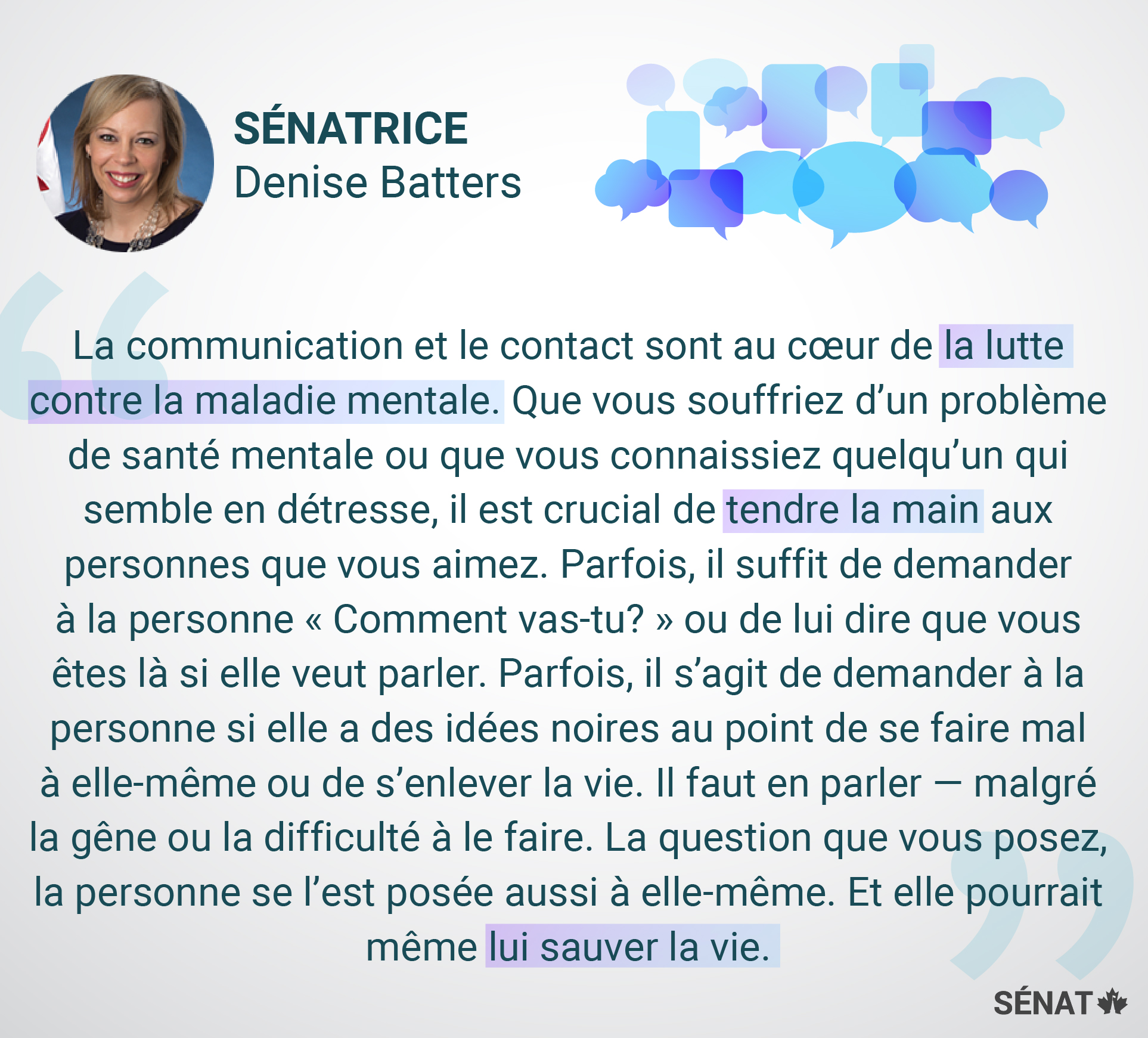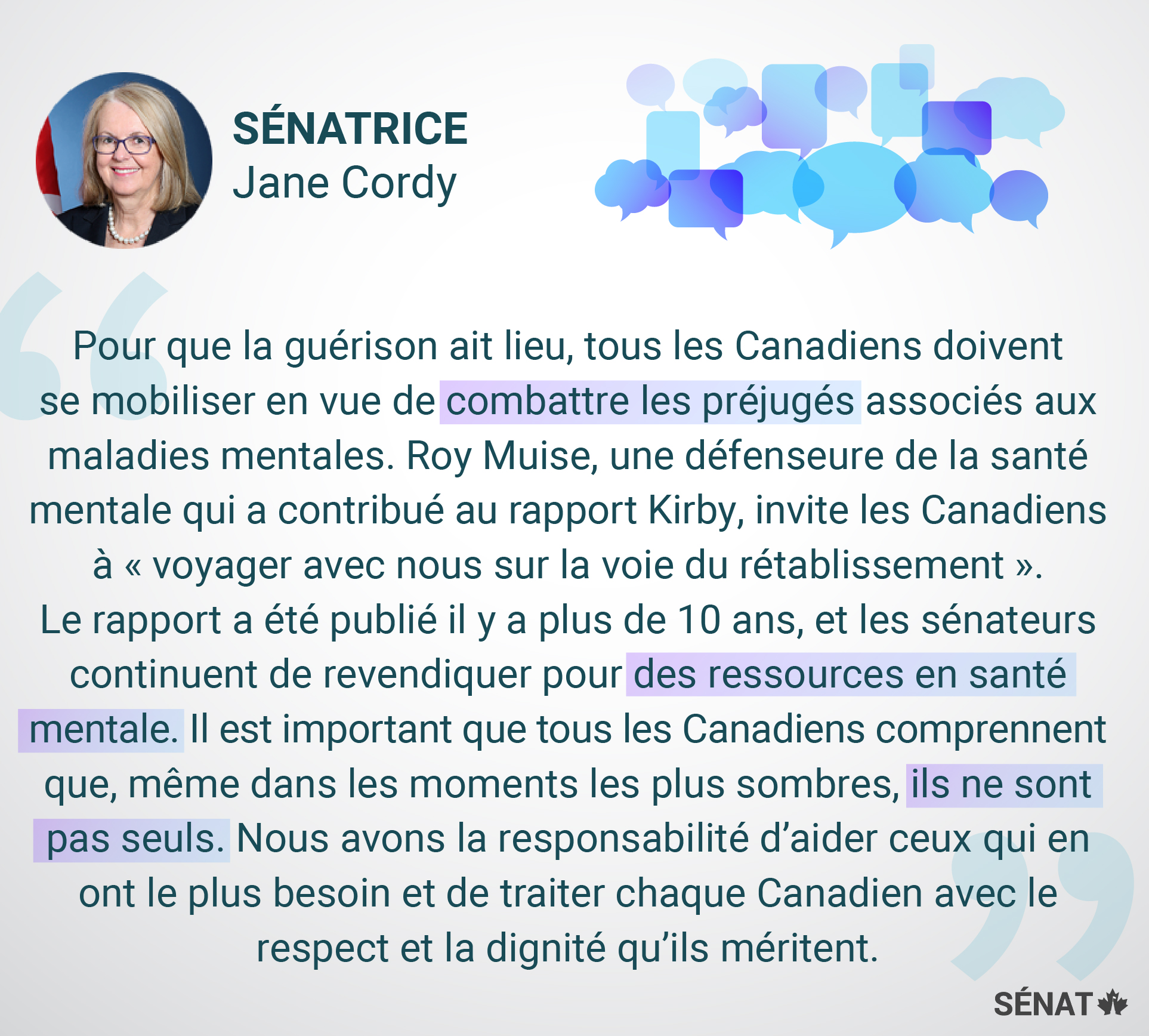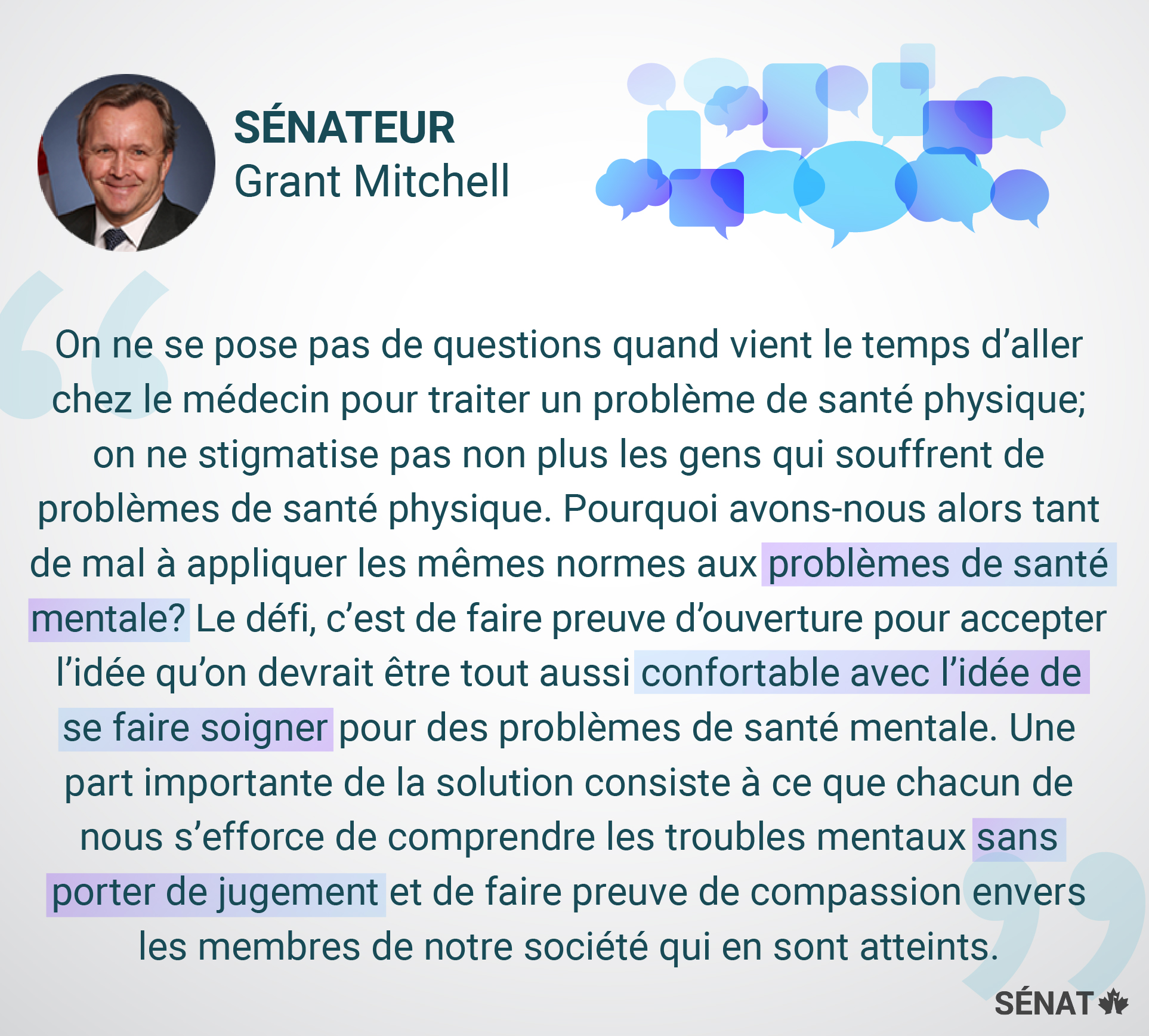 Les sénateurs démontrent leur engagement envers cette importante question sociale grâce aux efforts soutenus qu’ils déploient notamment en élaborant des projets de loi, en produisant des rapports et en se portant à la défense des droits en matière de santé mentale.