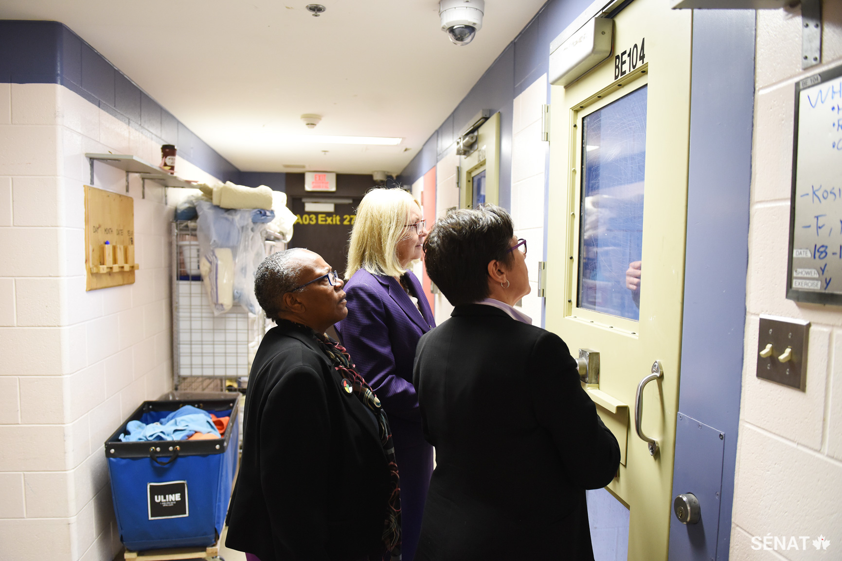 Les sénatrices Bernard, Cordy et Pate conversent avec un prisonnier à travers une fenêtre de cellule d’isolement.