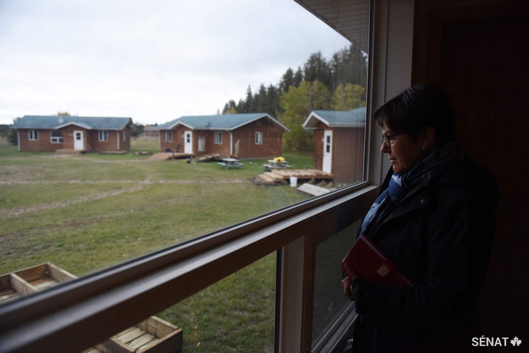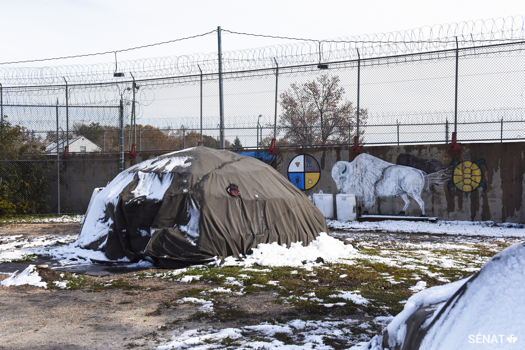 La sénatrice Kim Pate jette un coup d’œil sur le terrain du Pavillon de ressourcement spirituel du Grand Conseil de Prince Albert, où l’on trouve six pavillons, des sueries pour l’été et l’hiver, une salle réservée aux cercles de guérison et une salle d’administration. Les prisonniers du Pavillon de ressourcement sont appelés « famille » par les membres du personnel.